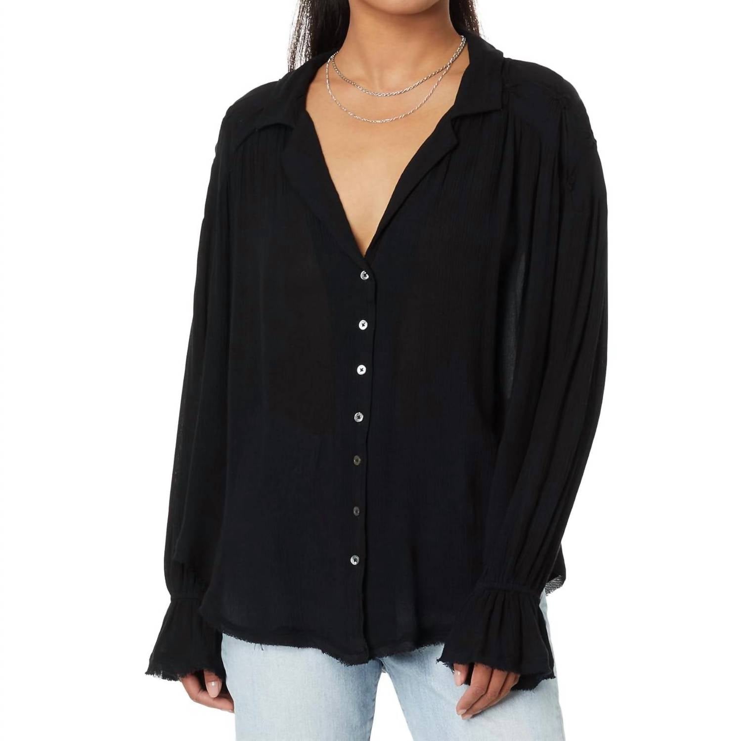 Button-down front creates a style that can be layered with ease. Long set-in sleeves feature ruffled openings. Straight yoke in back with smocked detailing. Loose fit silhouette. Sheer design. Straight hemline. 100% viscose. Machine wash, line dry. Imported. Product measurements were taken using size XS (Women's 0-2). Please note that measurements may vary by size. Measurements: Length: 27 in.