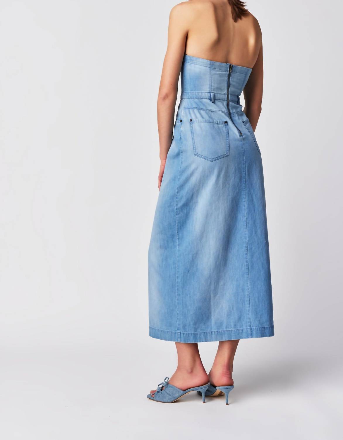 Fit: Slim at the bodice with relaxed column skirt. Features: Tube bodice silhouette, high-rise waist, side pockets, front slit hem feature. Measurements for size 6 - Bust: 33.75 in; Waist: 29 in; Length: 43.5 in. 100% Cotton.