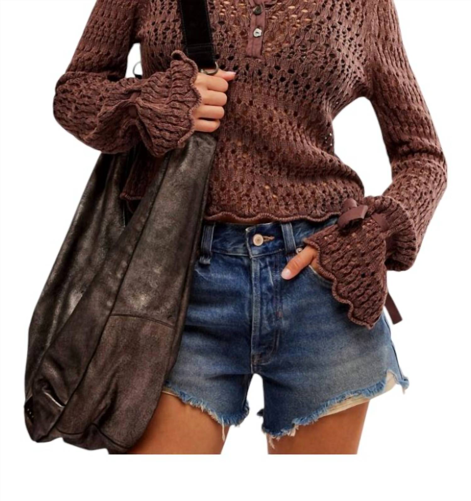 Knit textile. Partial front button closure. Flared cuffs with ribbon embellishment. Lightweight knit fabric. Hand wash recommended. Imported.