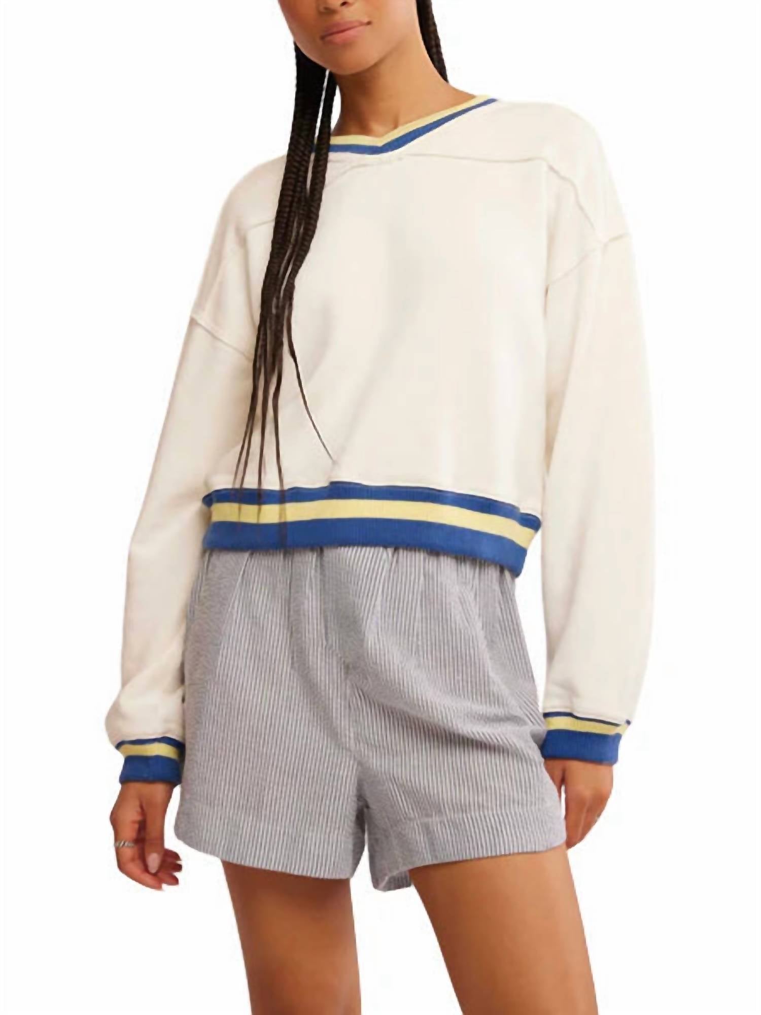 Experience the perfect blend of comfort and style with this trendy crew neck sweater, designed to effortlessly elevate your wardrobe. Pair it with your favorite denim and loafers for the perfect look. Introducing the Rio Sweatshirt by Free People, a stylishly essential piece that perfectly embodies effortless cool. Crafted from soft cotton, it has a slouchy, relaxed fit with long sleeves, a V-neckline, and drop-shoulder sleeves accentuated by cuffs. The contrast ribbed hems and exposed seams add a touch of distinctive flair to this ivory striped design. Care: Machine wash cold, line dry. Closure: Pull-on. Garment length: 21 inches.