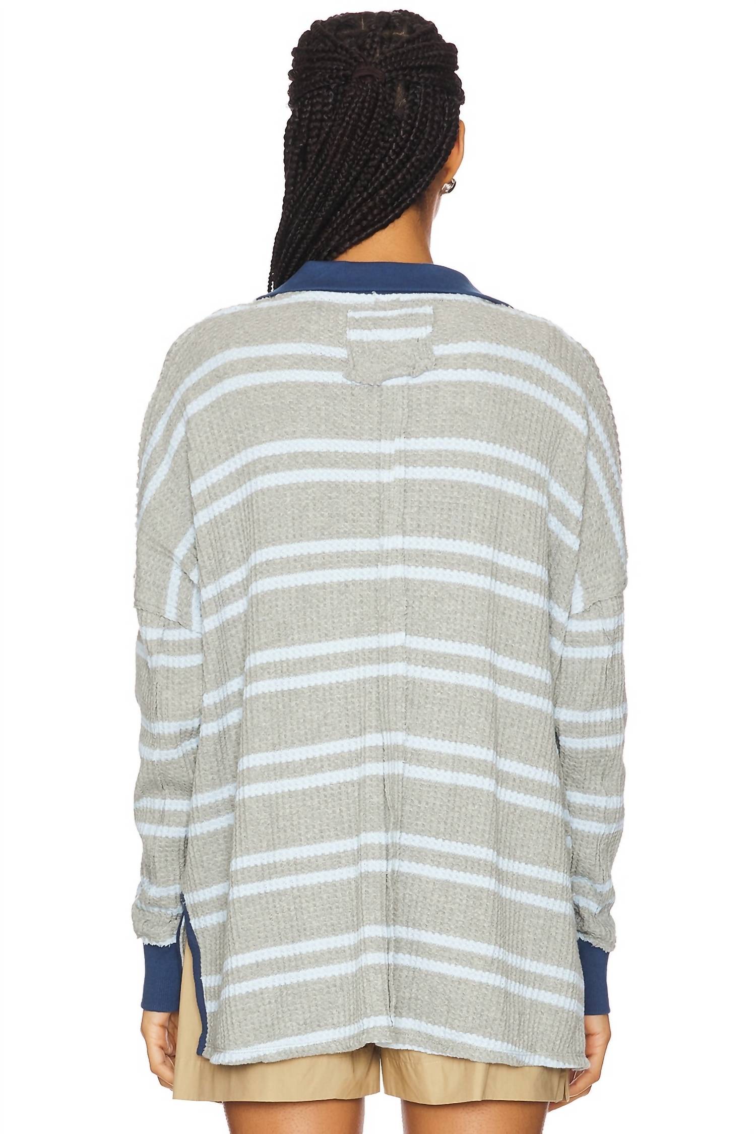 Great fit, cute design, soft fabric. You'll love everything about this long sleeve tee. Elevate your casual wardrobe with the Striped Travis Polo Top by Free People, a chic option in Grey Combo featuring a classic V-neck design. Crafted with long sleeves and a mix of 97% Cotton and 3% Elastane, this top promises comfort and flexibility. Made in Vietnam with a jersey fabric, it is perfect for effortless styling. Closure: Partial button placket and pull on. Care: Machine wash and tumble dry.