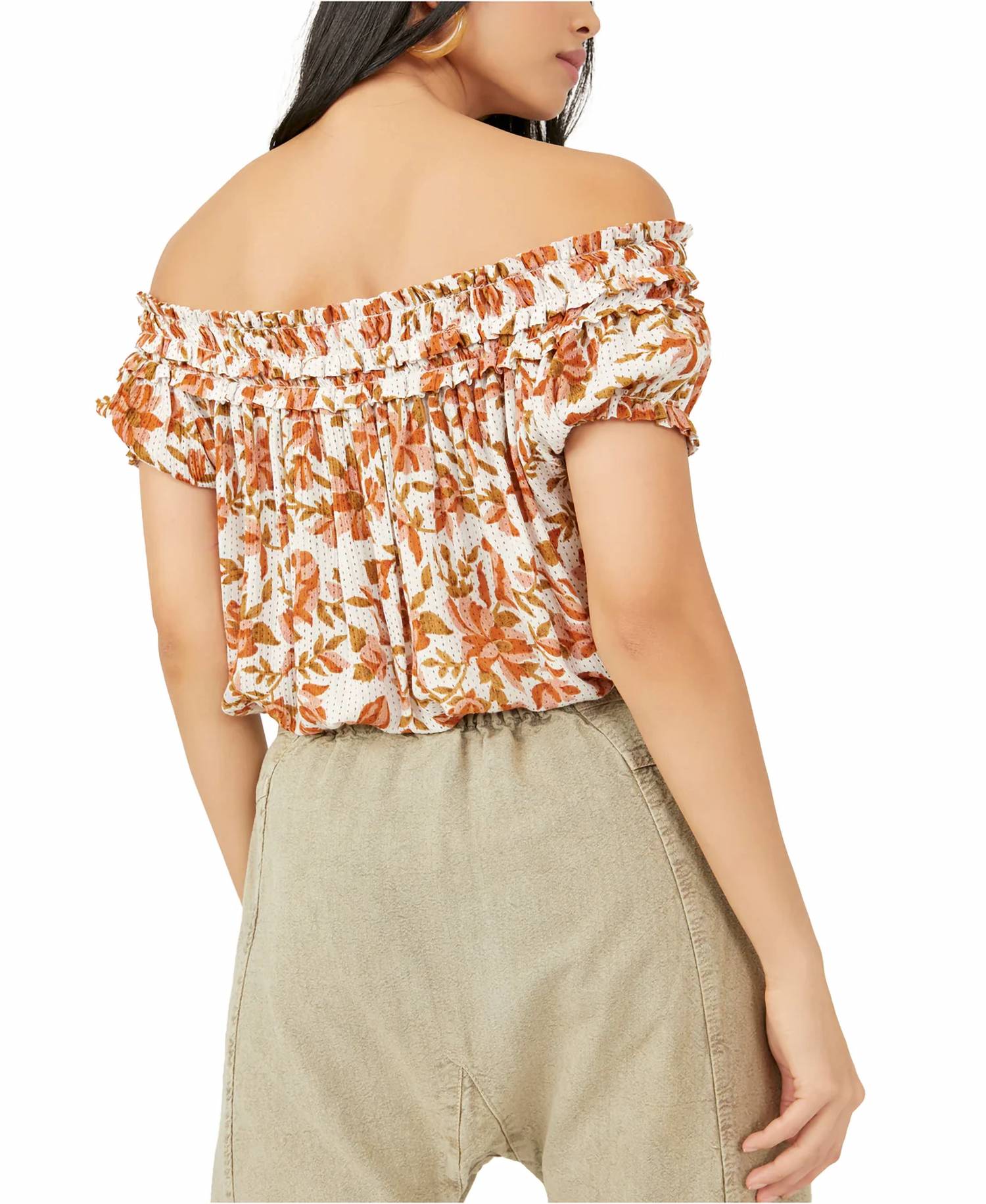 A timeless blouse that will never go out of style. Featuring an elasticized neck and waist. Off-the-shoulder neck. Short sleeves. Fabric: 100% Viscose. Hand wash.
