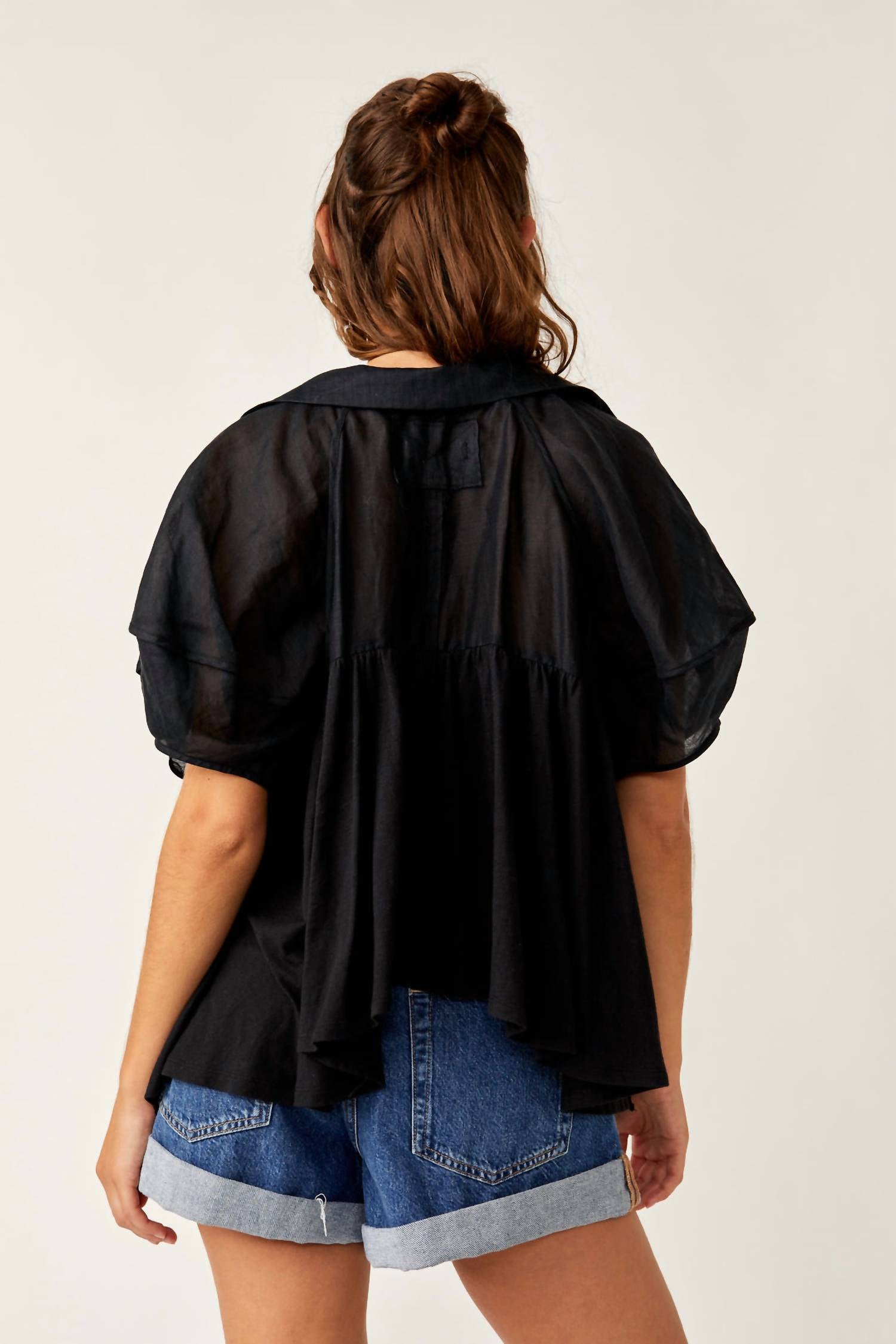 This Top features a relaxed fit with puffy sleeves and an asymmetric hemline. Billowy. Soft fabrication with a lightweight feel, collared neckline, puffy sleeves, exposed seam detail. Hand Wash Cold. Import. Measurements for size small. Bust: 52 in. Sleeve: 14.5 in. Length 27.75 in. 100% Cotton. 55% Ramie, 45% Cotton.