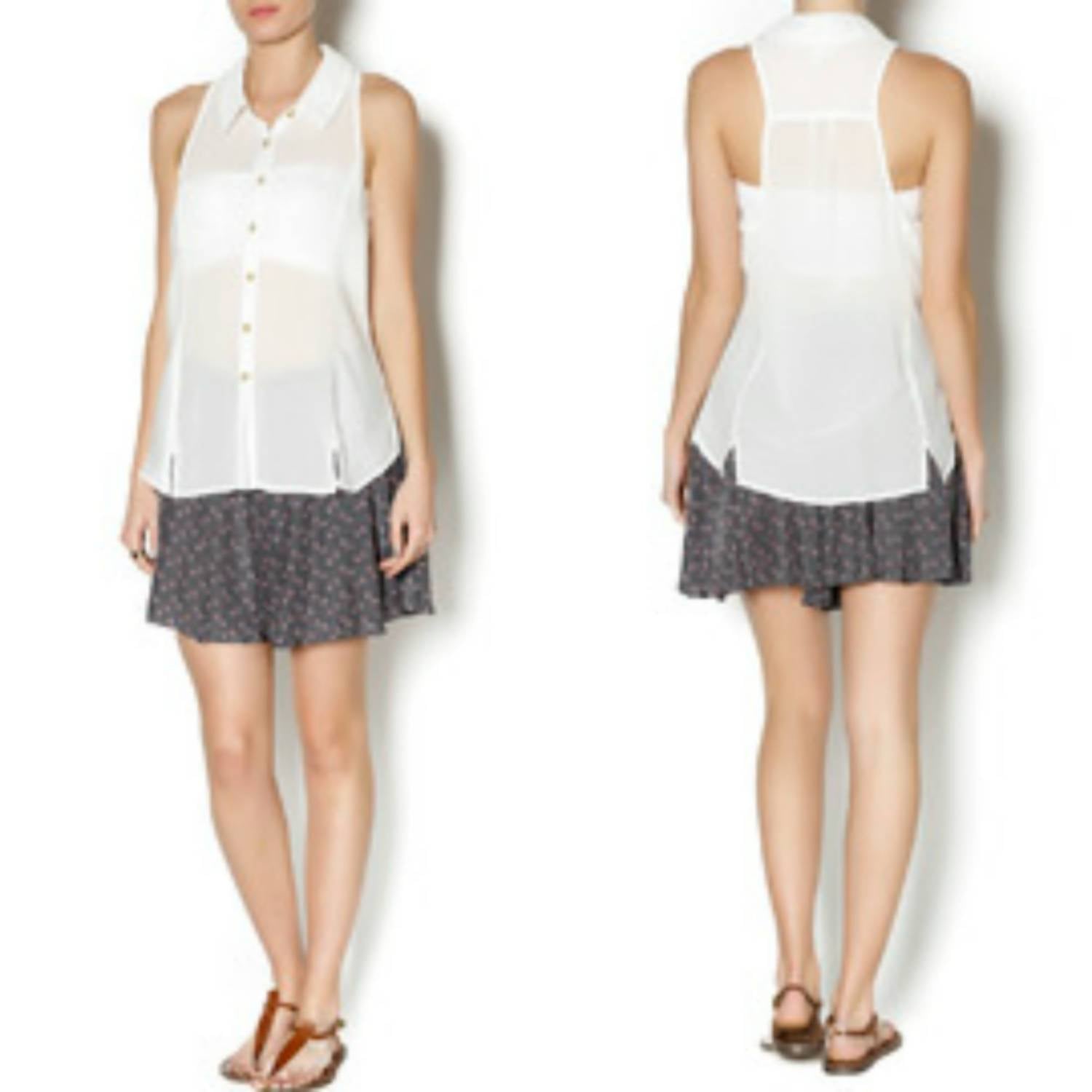 This is a classic, collar button down tank in ivory. It goes perfect with skinny denim and flats this fall! Sheer.