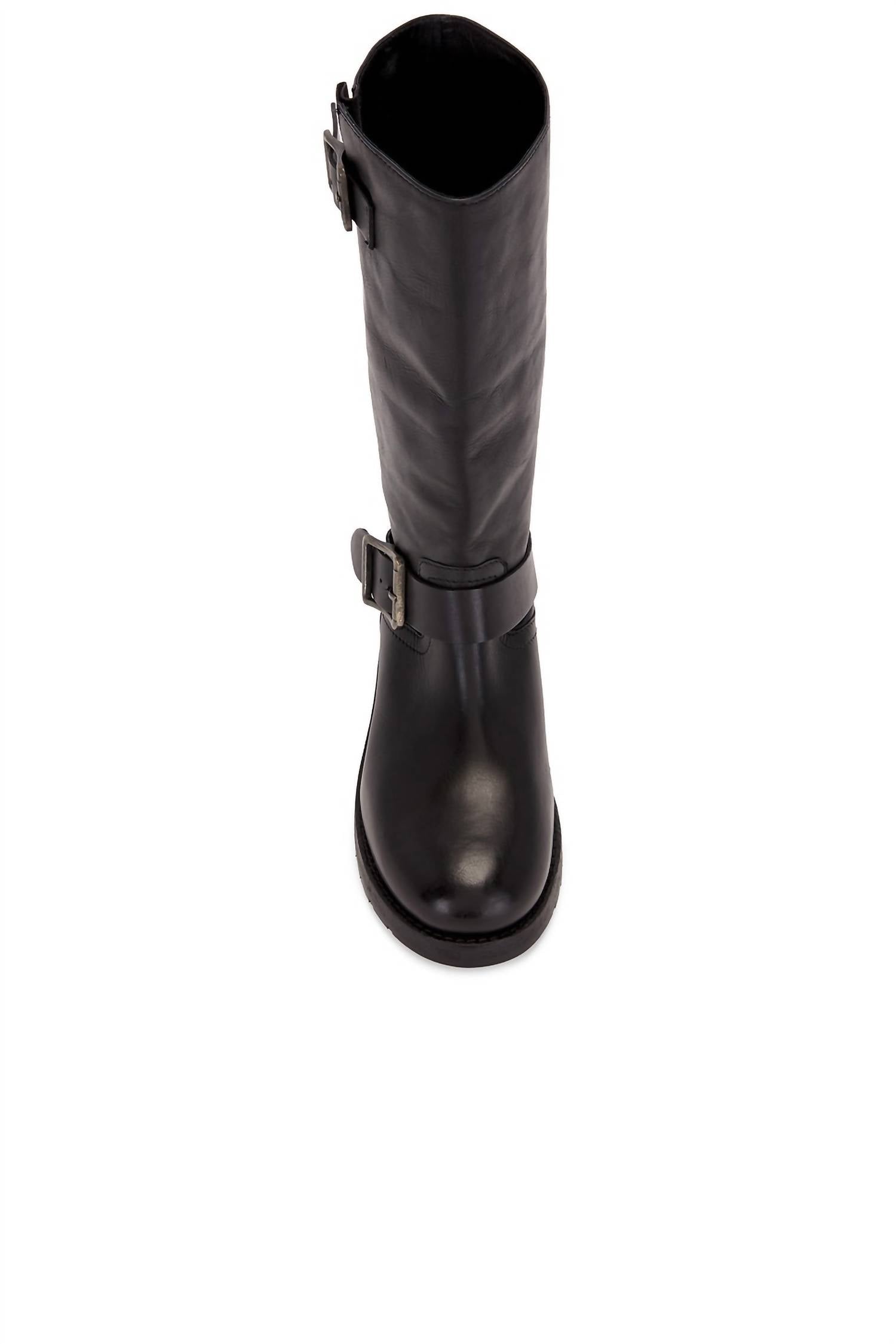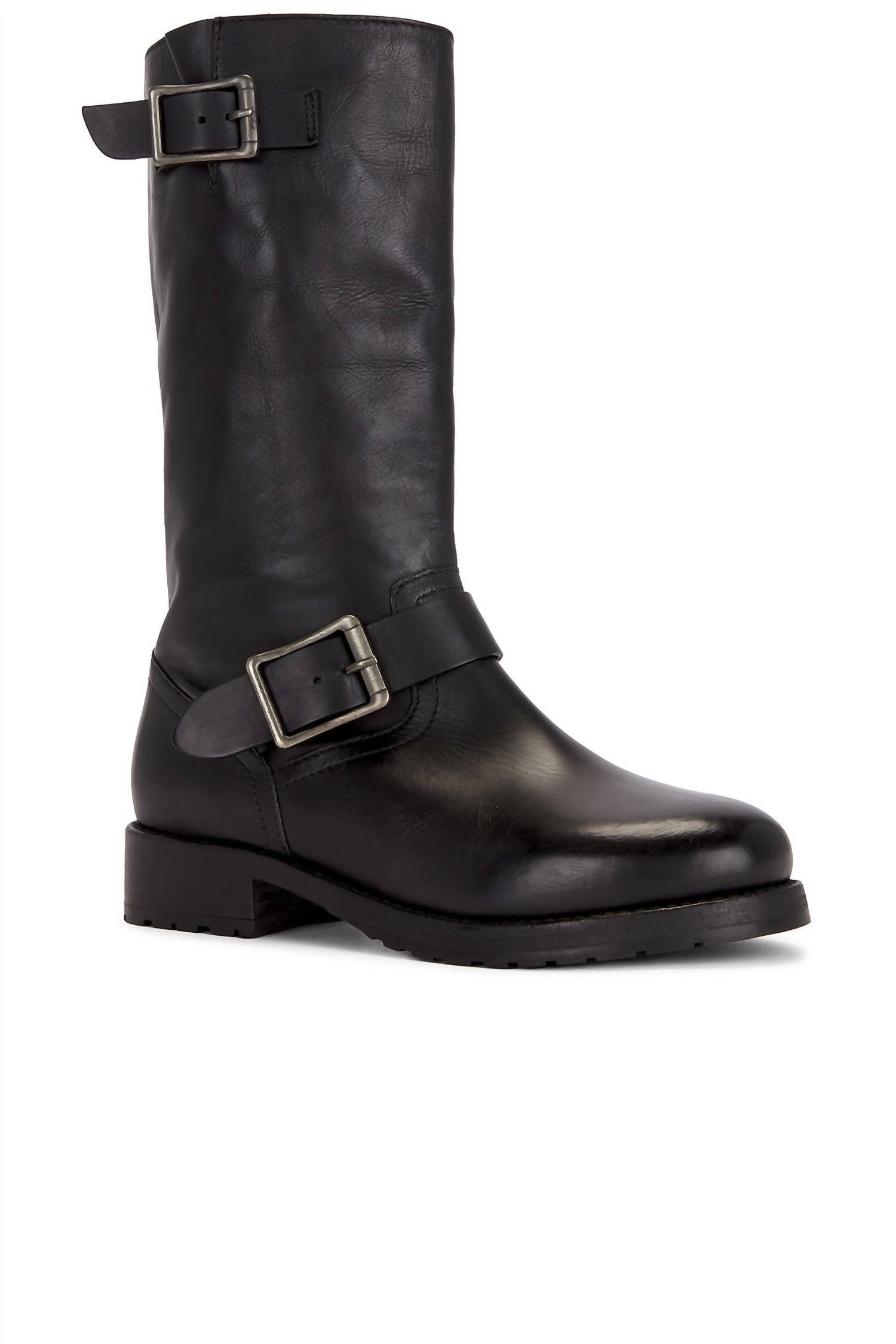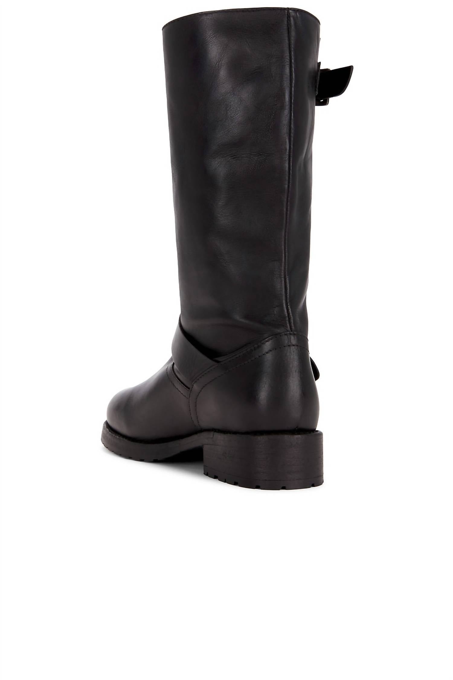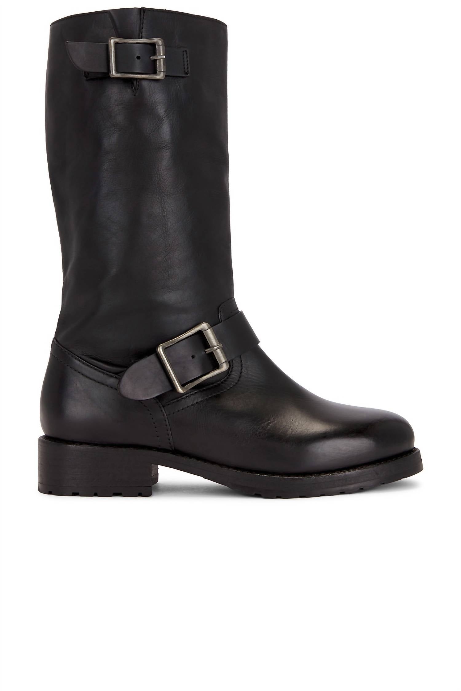 Meet the Women's Ride Or Die Engineer Boot by Free People, a chic and sporty addition to your footwear collection. Crafted in black leather, these boots feature silver-tone hardware, a leather lining, and a leather sole, all expertly made in India. The design includes buckle-trimmed ankle and side straps, rounding off with a classic round toe and a comfortable 1.4-inch block heel. The shaft measures approximately 10.75 inches, with a circumference of 48 cm.