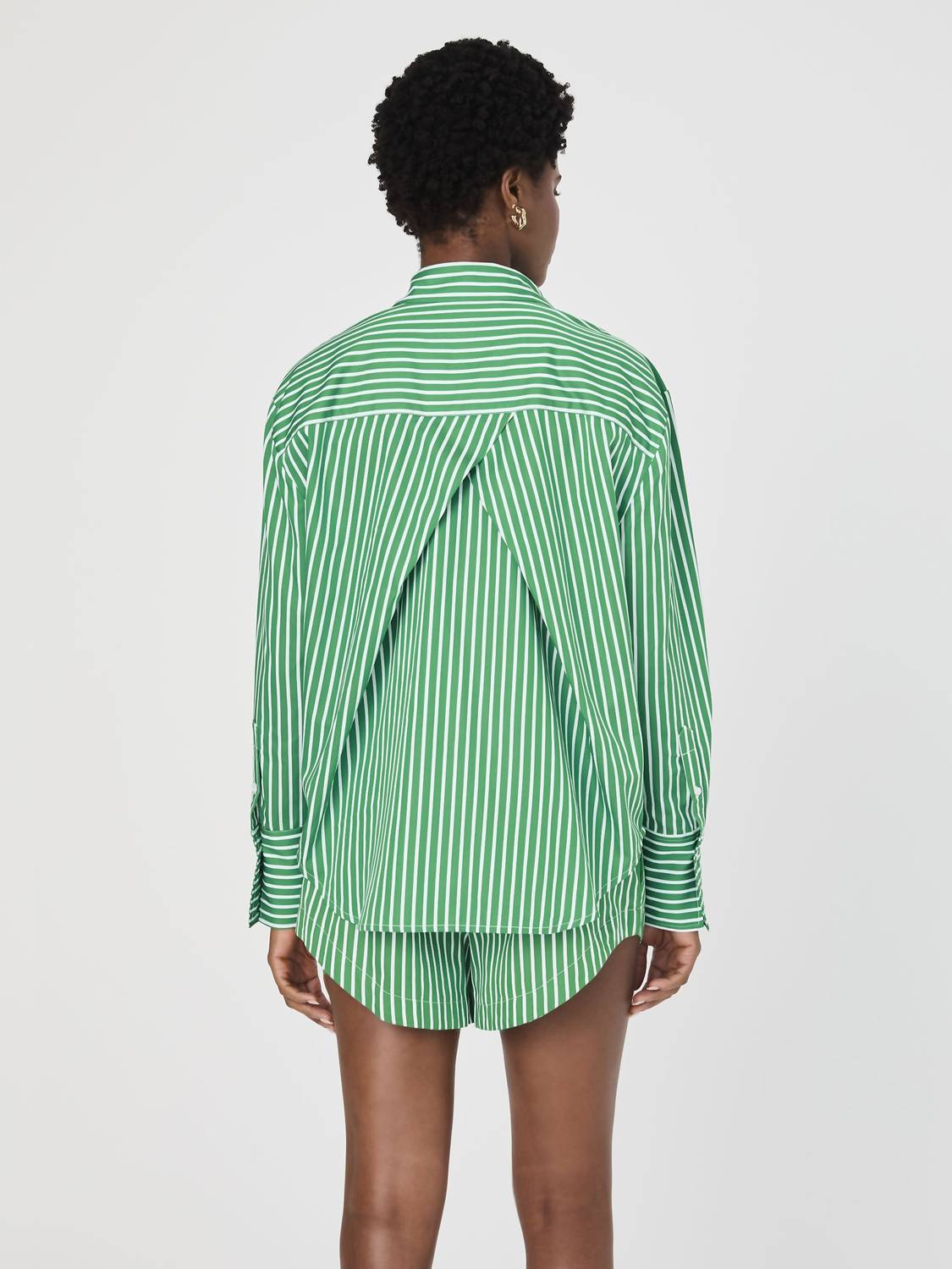 Perfectly tailored and soft to the touch. Elevate your seasonal wardrobe with this sharp, striped poplin shirt. Thoughtfully designed with angled yoke seams and distinctive back pleats, it offers a fresh take on a timeless staple. Finished with a classic collar and button-down front, it’s easy to style with trousers or worn as a set with coordinating shorts.