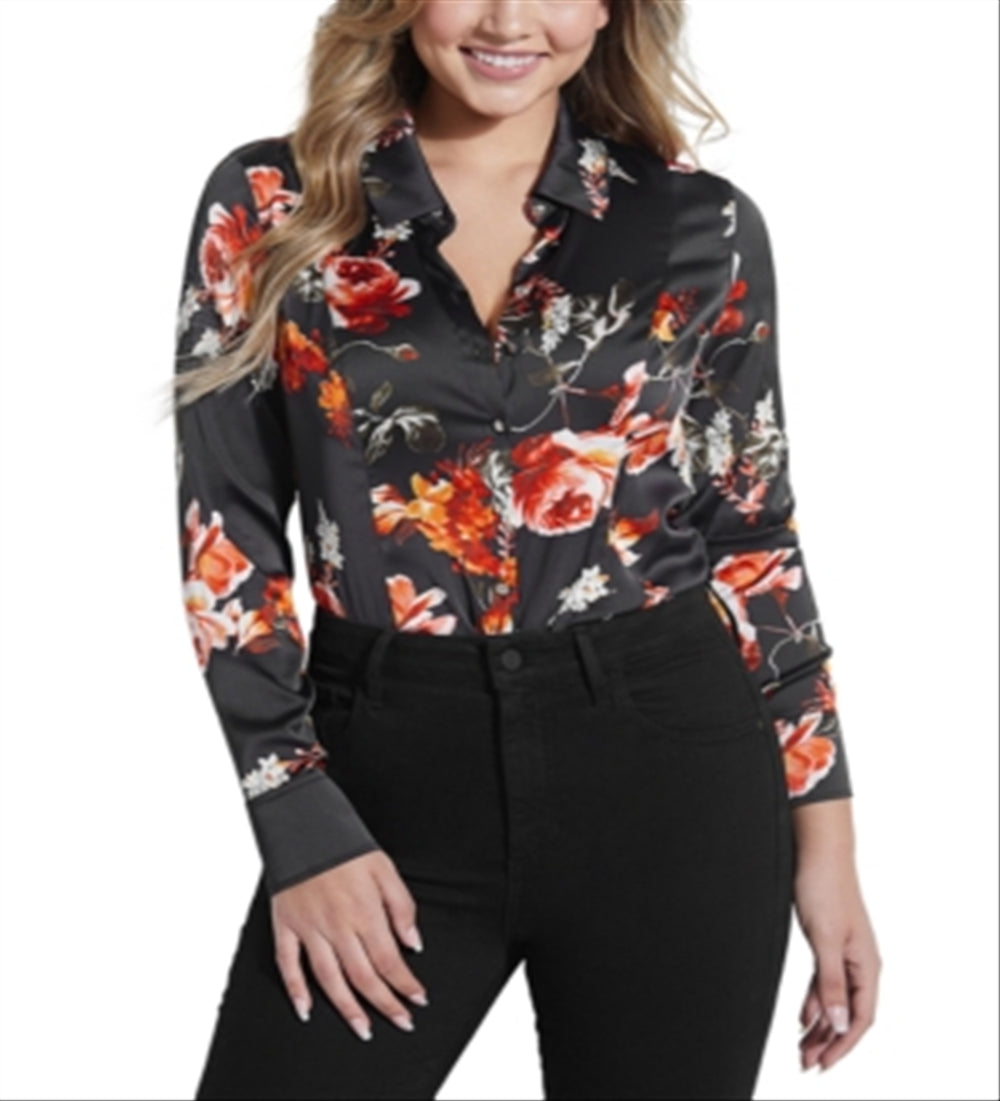 Play it up with fiery florals in this satin long-sleeve shirt from GUESS. Wear it tucked in or out over any bottom.| Point collar; front-button closures| Satin finish| Polyester| Hand wash| Imported