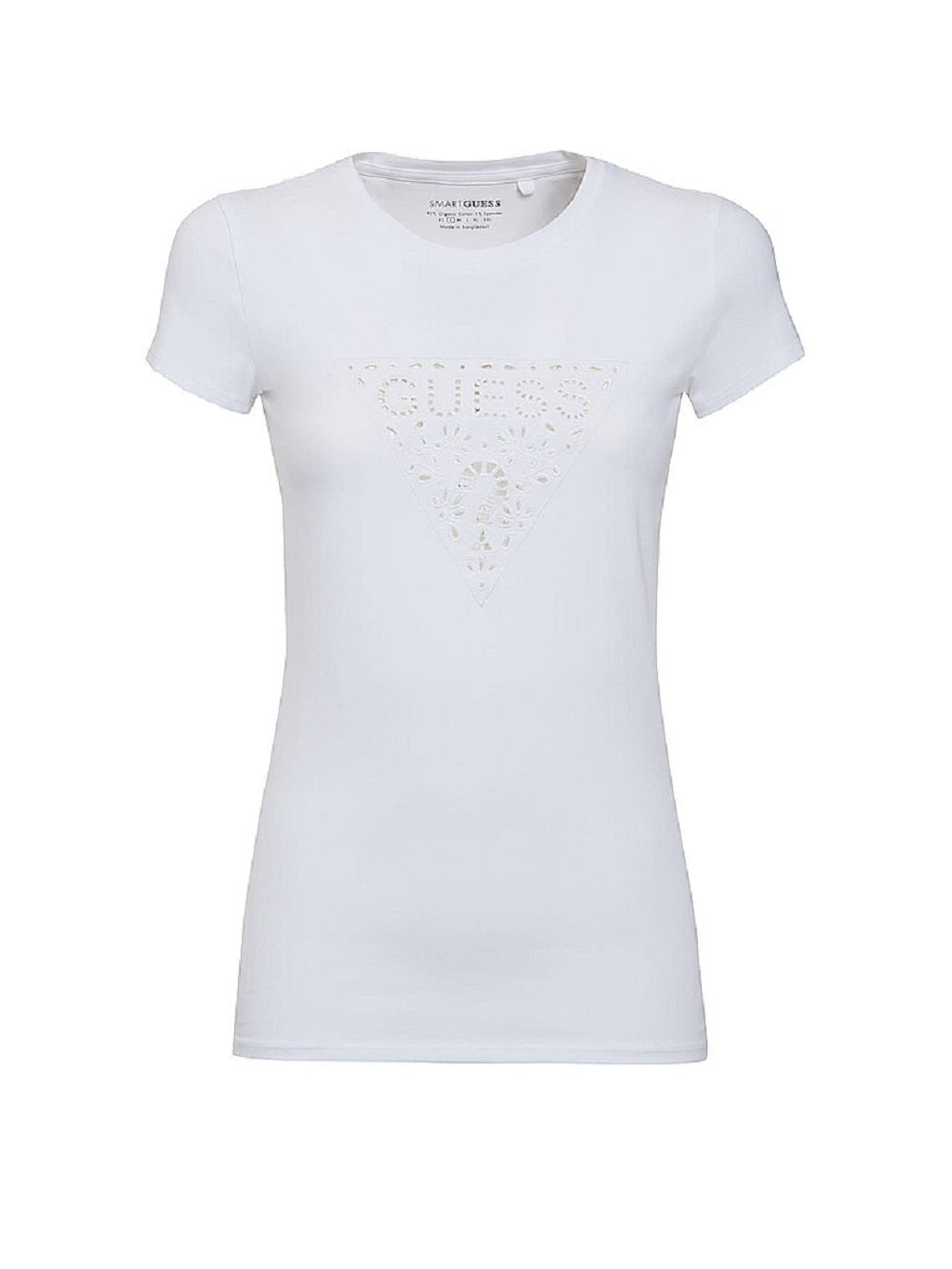 An eyelet logo patch in the brand's iconic triangle shape dresses up a short-sleeve T-shirt from GUESS