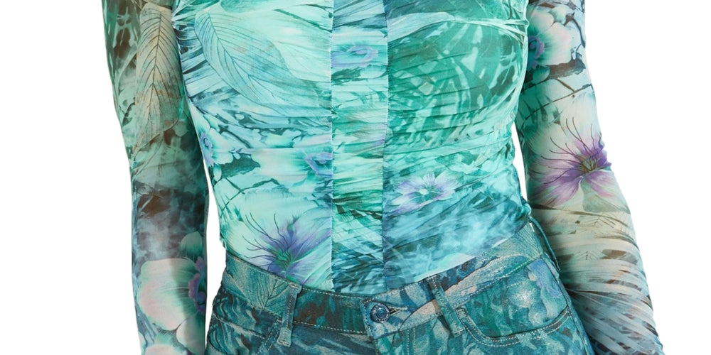 GUESS Women's Kimbra Shirred Mesh Top Blue Size Large