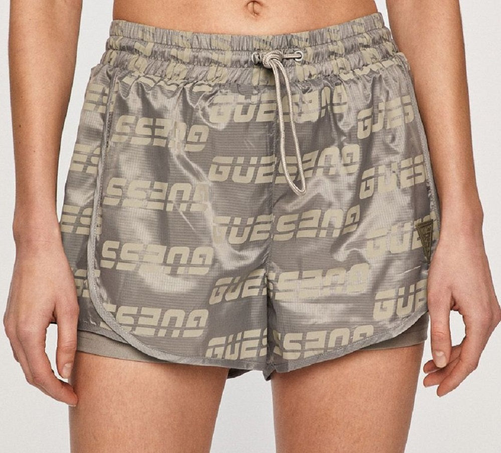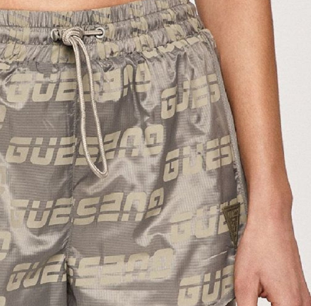 Spelling out sporty GUESS style in a tone-on-tone logo print| these cool shorts are finished with a toggle drawstring.| Approx. inseam; 3-3/8| Rise; approx. 11-5/8| Pull-on style| Allover logo print; solid-color trim at hemline and side panels; drawstring with toggle at front waistband