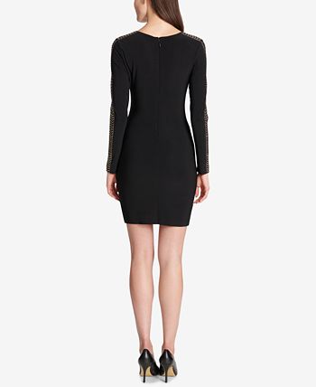 Long sleeves with stud embellishments|Imported|V-neckline; sheath silhouette|Ruched at sides|Hidden back zipper with hook-and-eye closure|Connect with a stylist & get free expert advice online or in stores for your wardrobe| home & more. Book Now