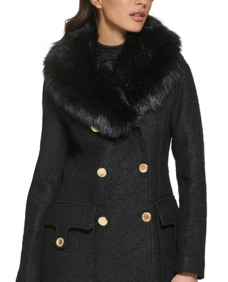 GUESS Women's Faux Fur Collar Double Breasted Walker Coat Black Size Small