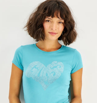 GUESS Women's Embellished Heart T-Shirt Blue Size Small
