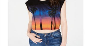 Guess Women's Printed Cap Sleeve Crew Neck Crop Top Black Size Large