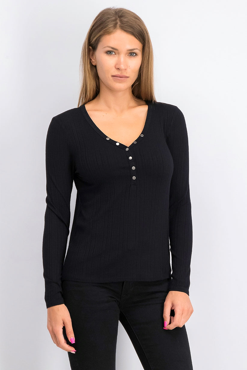Fitted; hits at hip|Henley neckline with snap buttons|Rib knit|Rib knit