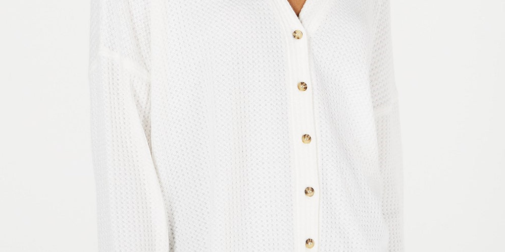 Approx. model height is 5'10" and she is wearing a size medium|Relaxed fit; hits at hip|V-neck; front button closures|Textured fabric; available in solids and stripes|Long sleeves with drop shoulders|Polyester/rayon/spandex|Machine washable