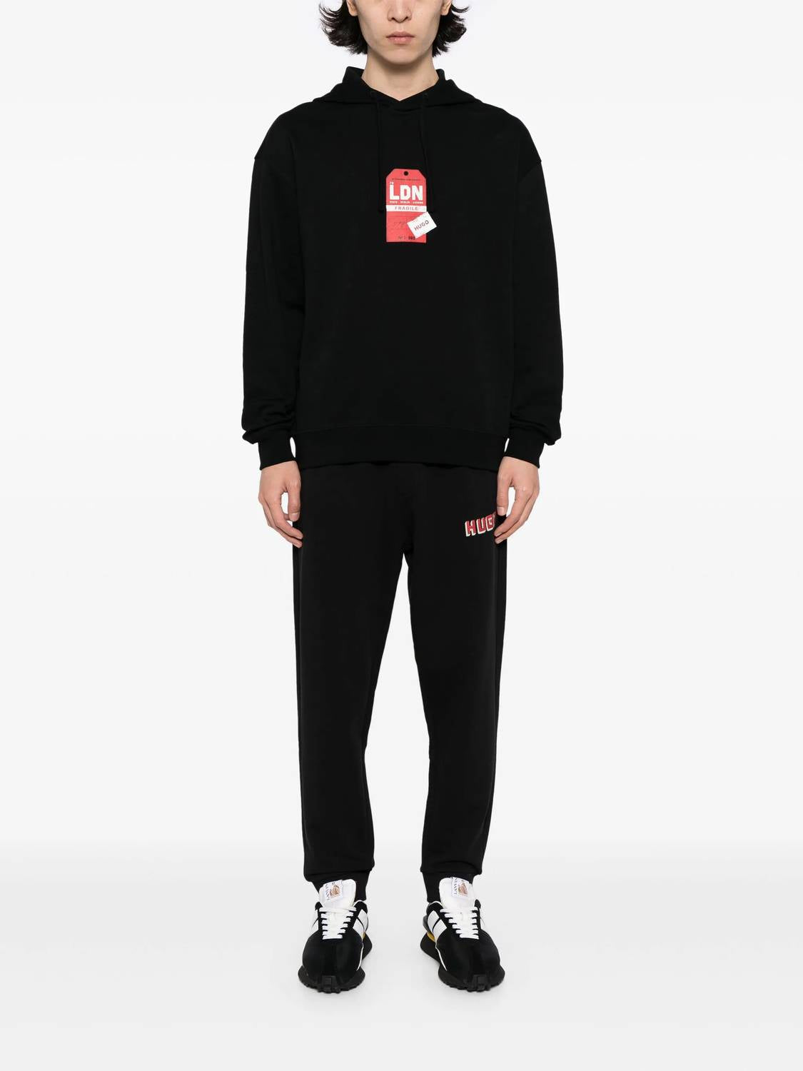 Striking graphic prints in black and red. Designed with a drawstring hood, drop shoulders, and long sleeves. Combines comfort and fashion effortlessly. Made entirely from cotton. Promises cozy wear and features ribbed trims and a straight hem. Care is simple with machine wash instructions. Convenient pull-on style makes it easy to wear.