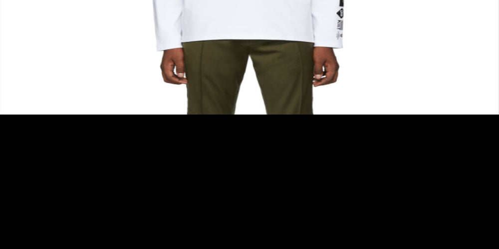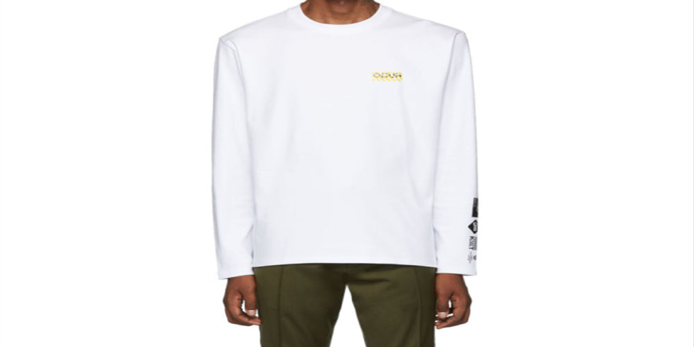 long sleeve cotton jersey t-shirt in white| rib knit crewneck collar| logo printed in yellow and black at chest| graphics and logo printed in black at sleeve and back|supplier color; white