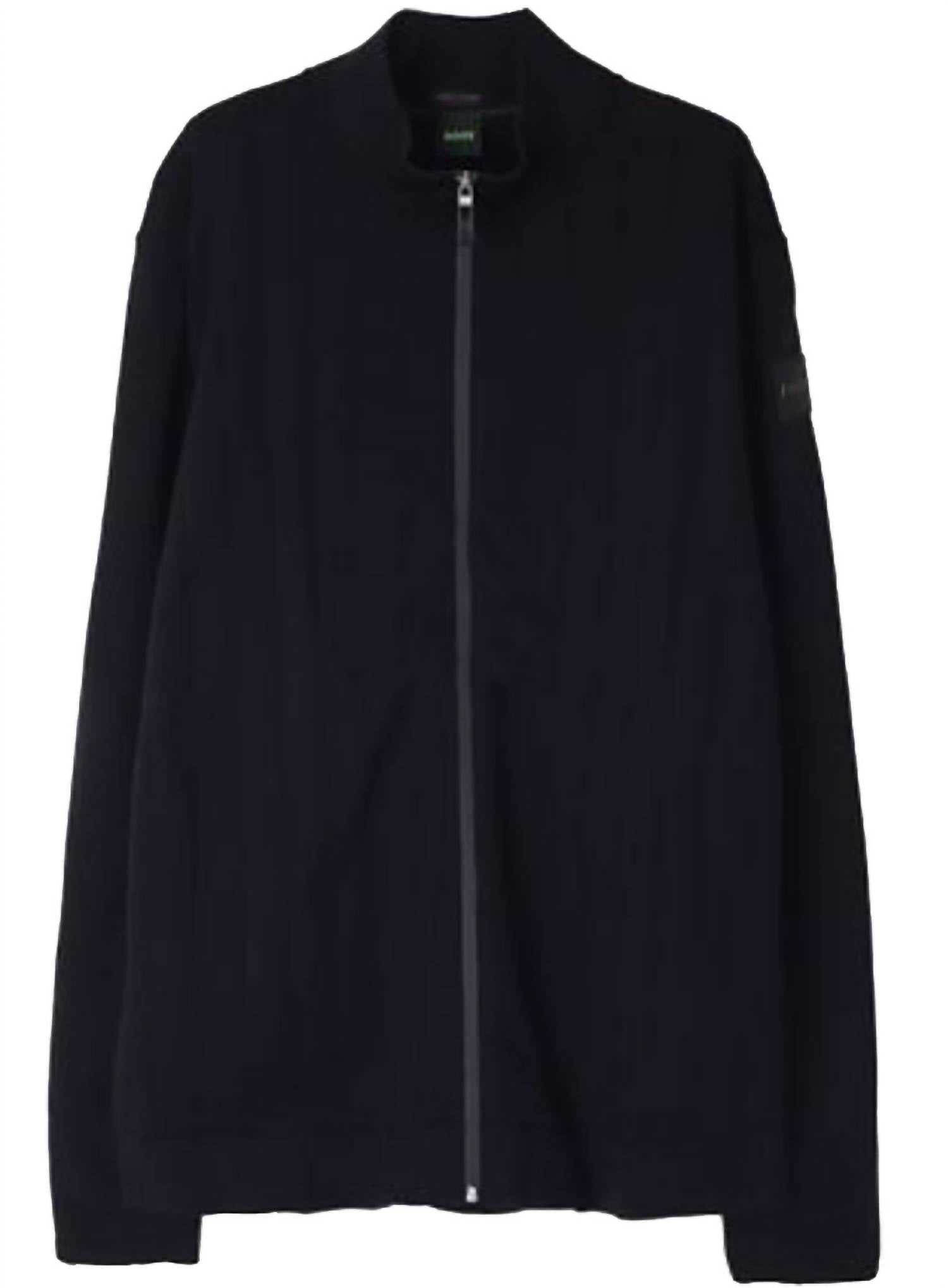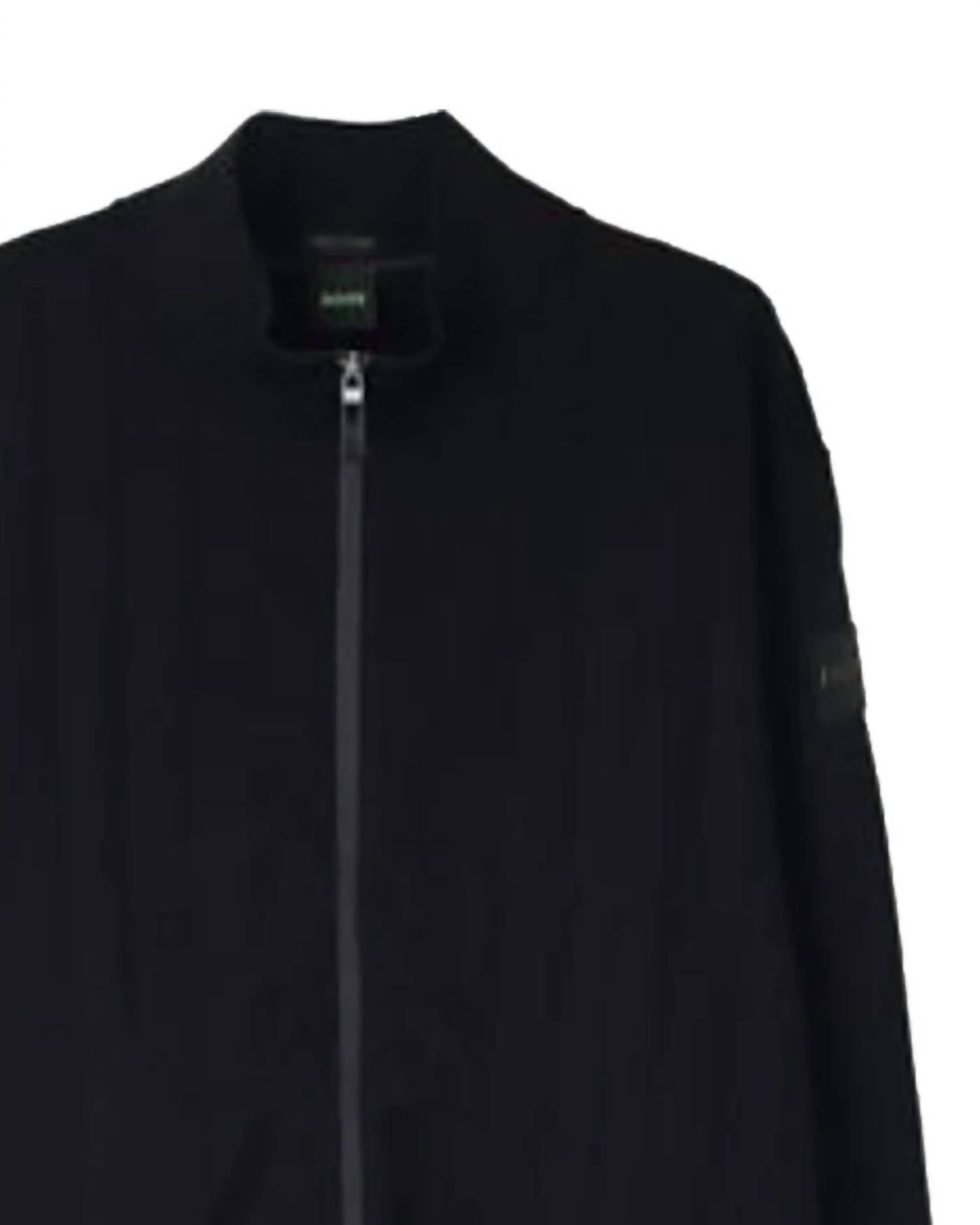 The Stand Up Collar Cotton Blend Zardin Jacket by Hugo Boss is a sleek addition to any travel or workwear wardrobe. With long sleeves and a full zip closure, this black jacket features a solid pattern and a standout logo on the arm. Made from a cotton and polyester blend, it offers both comfort and style. Care: Machine wash. Also perfect for Father's Day gifting.
