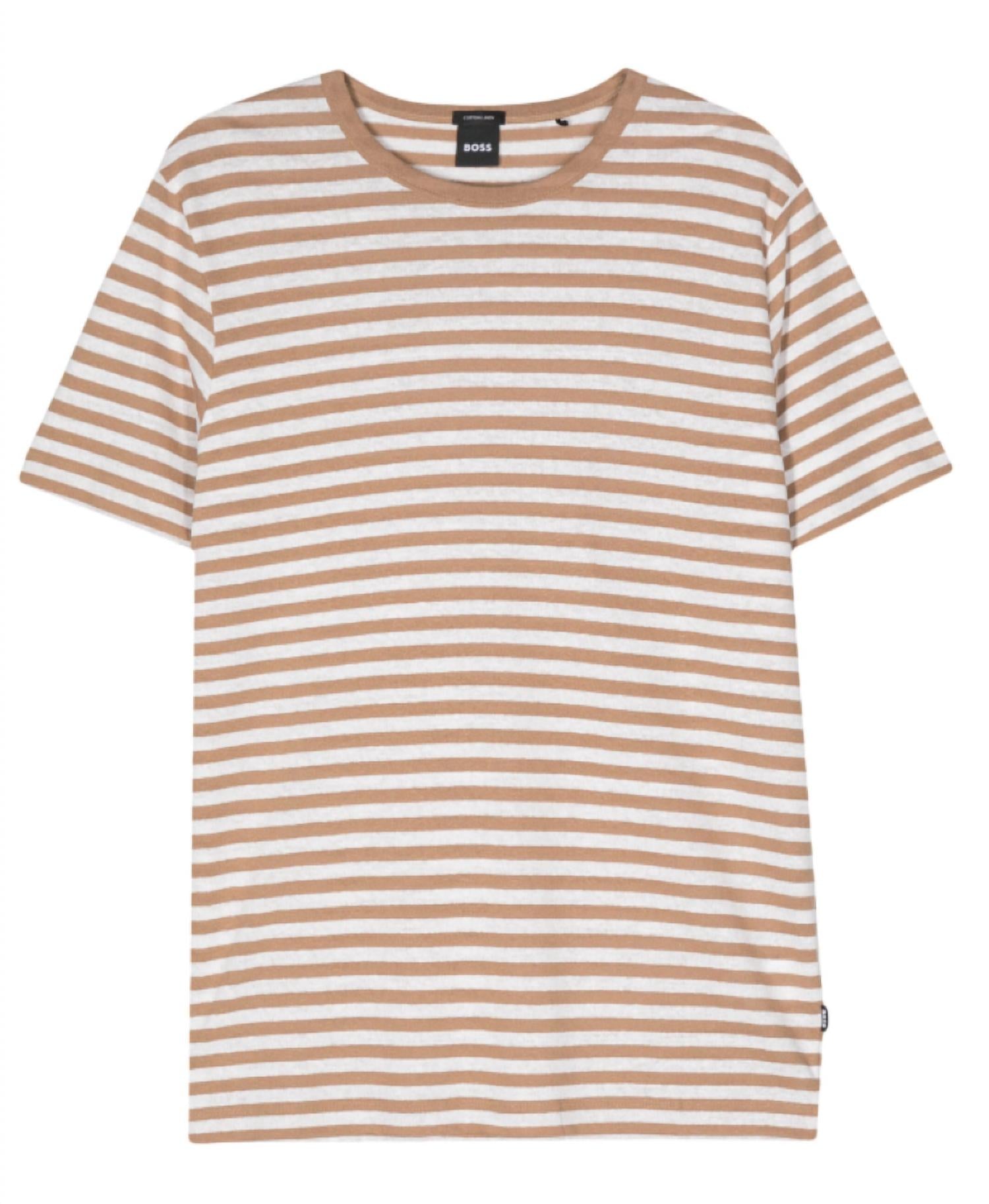 Discover the Men's Tilburt Tee by Hugo Boss, a stylish beige tee perfect for casual outings. This short sleeve top is crafted from 100% cotton for a soft and breathable feel, complemented by a classic crew neckline for effortless wear. Closure: Pull on. Care: Machine wash and tumble dry. This tee is designed with a striped pattern for a touch of modern flair, offering a regular fit for comfortable all-day wear.