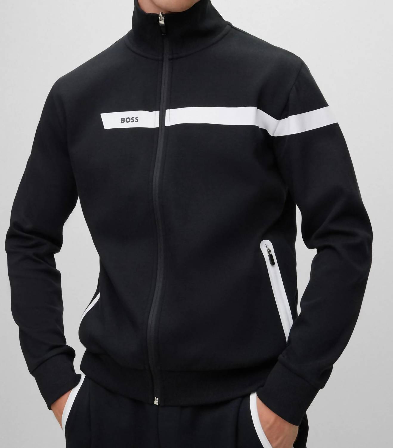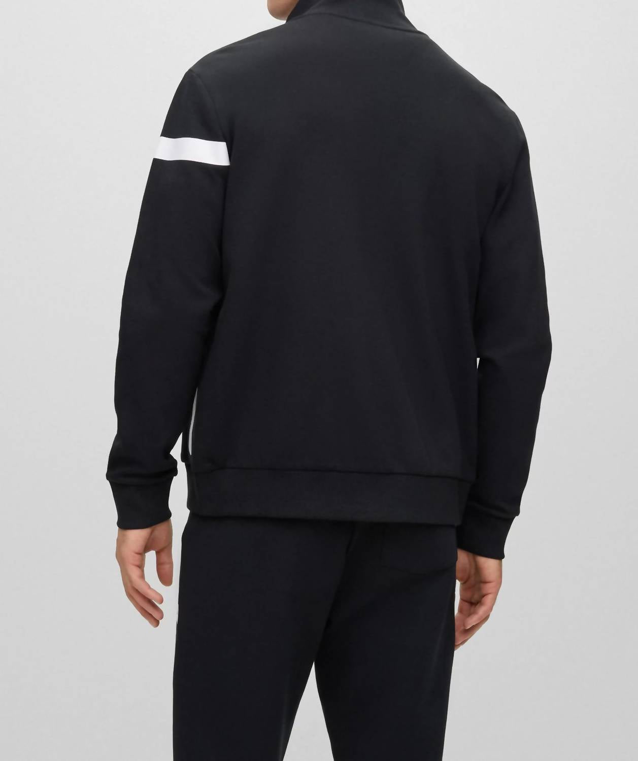 Discover the Skaz Sweatshirt by Hugo Boss, crafted with long sleeves and 100% cotton for ultimate comfort and style. This solid black men's sweatshirt features a mockneck design, complemented by a full zip closure and white trim for added sophistication. Originating from an imported collection, it includes functional pockets for convenience. For care, simply machine wash and lay flat to dry to maintain its pristine condition.