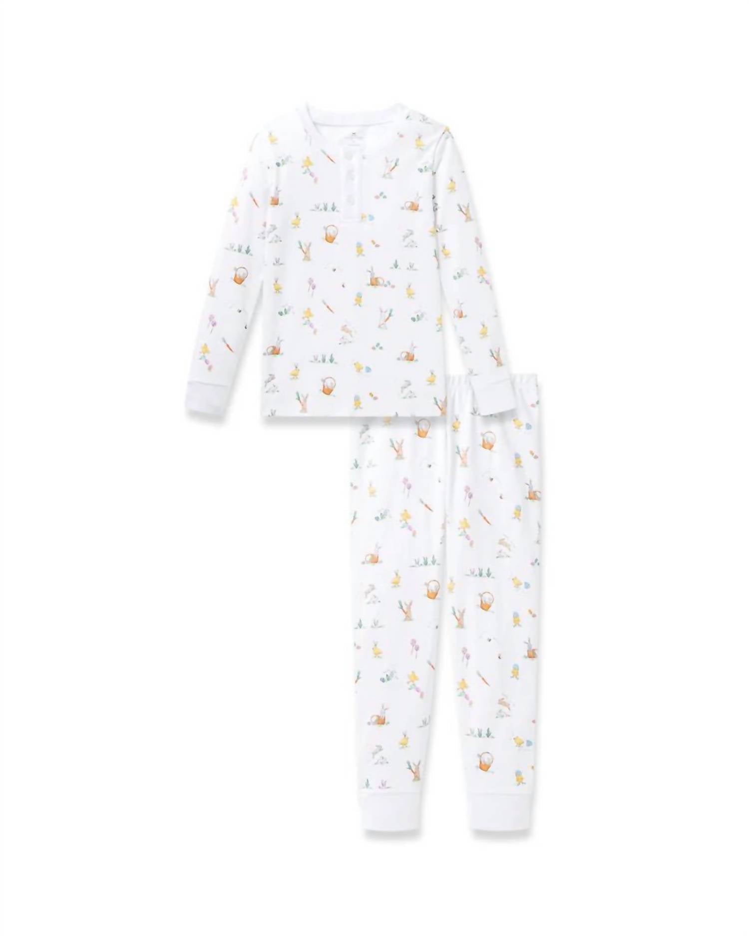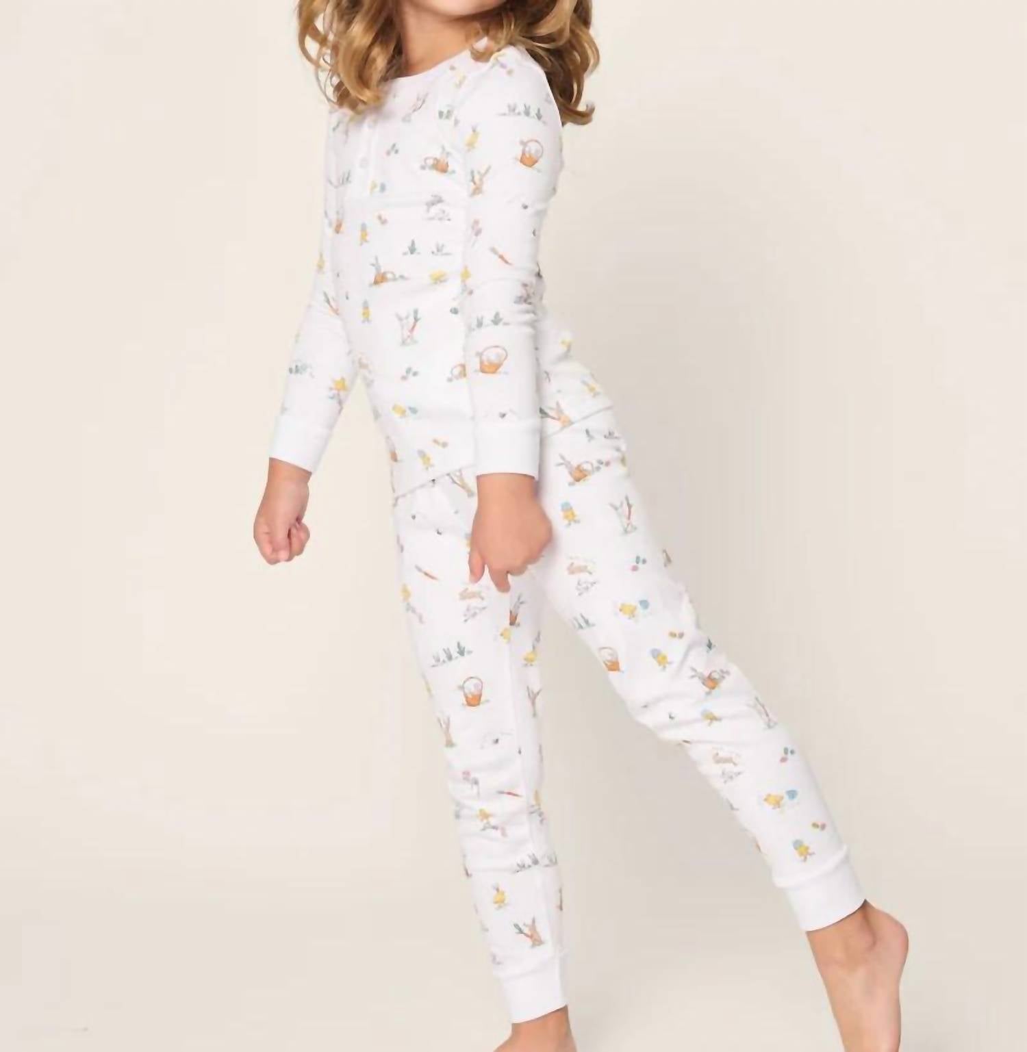 Introducing the Easter Frolic Pajama Set by Petite Plume, a delightful addition to your child's wardrobe with charming hand-illustrated bunnies and baskets. This set includes a long sleeve top and matching pants, crafted entirely from 100% Peruvian Pima Cotton, ensuring a soft and snug fit conducive to active movement. The high-quality fabric maintains its softness, shape, and vibrant print even after multiple washes, making it a long-lasting favorite. For easy care, machine wash cold with like colors and machine dry without heat.