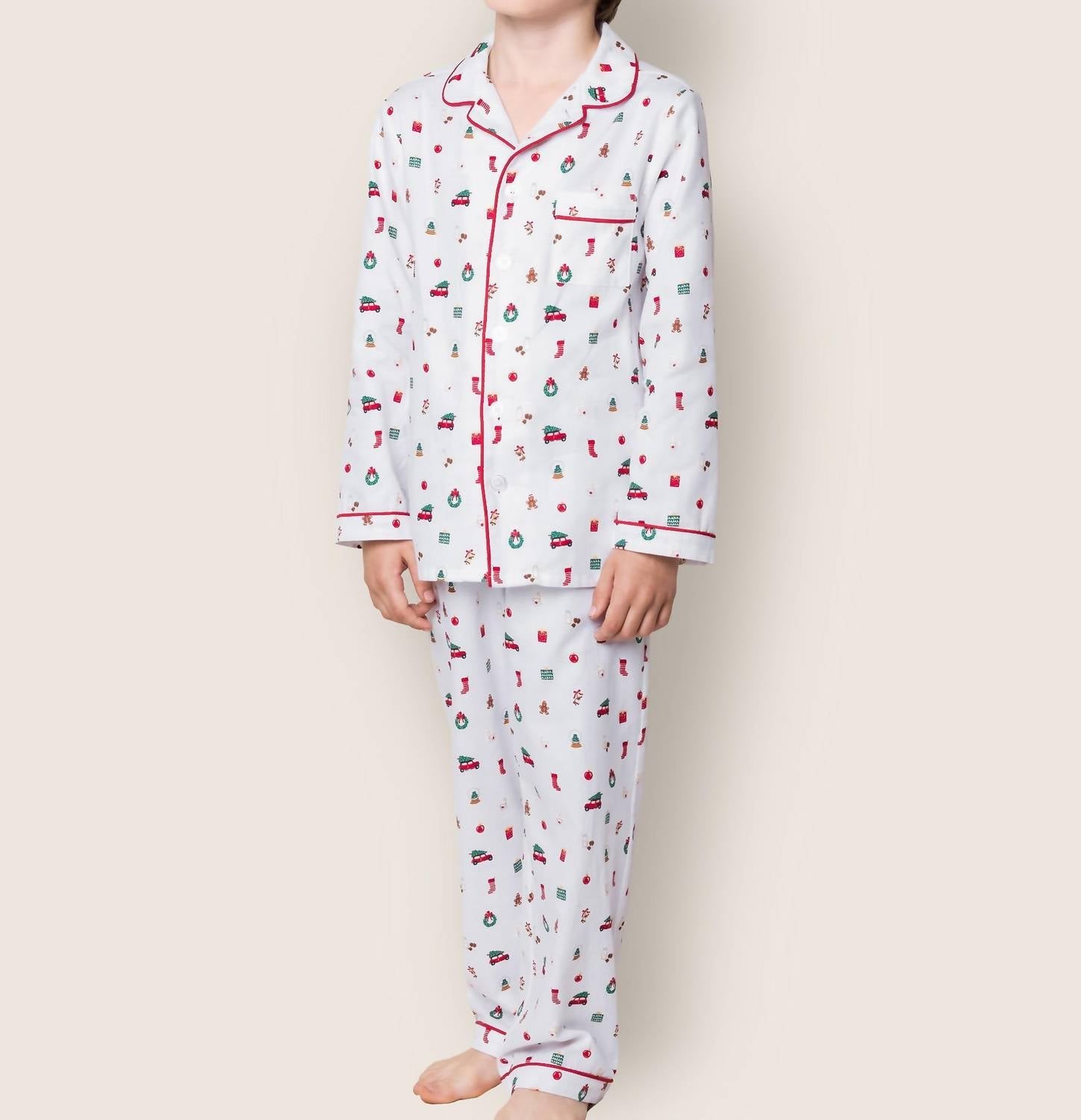 Introducing the Kid's Twill Pajama Set by Petite Plume, available in a charming Winter Nostalgia pattern that encapsulates festive cheer and coziness. This pajama set is crafted from a cotton blend and features red piping with elegant pearl button closures. Designed for boys, it boasts a perfect blend of comfort and safety by incorporating inherently flame retardant fibers without harmful chemicals. Care is a breeze: machine wash cold with like colors; note that the fabric may shrink 3-5% upon washing.