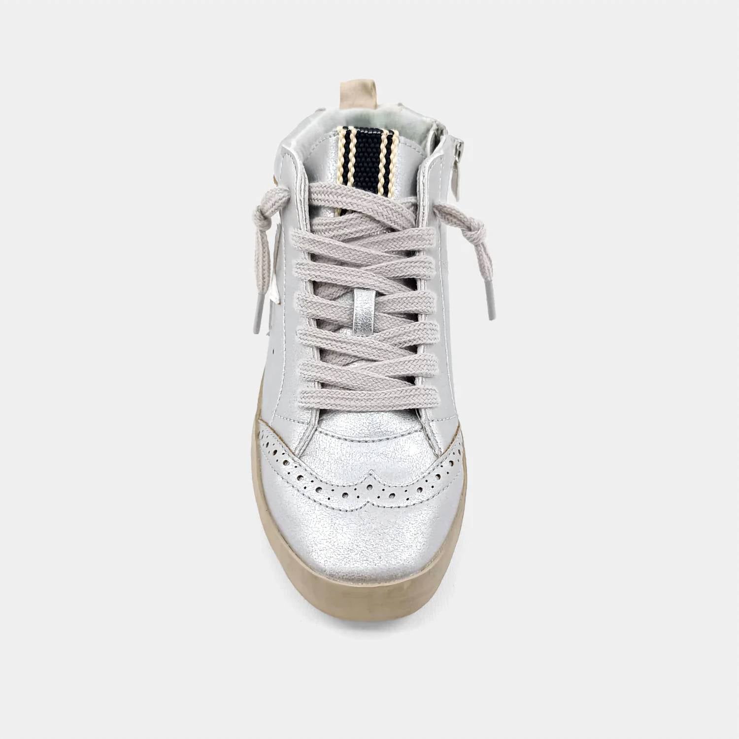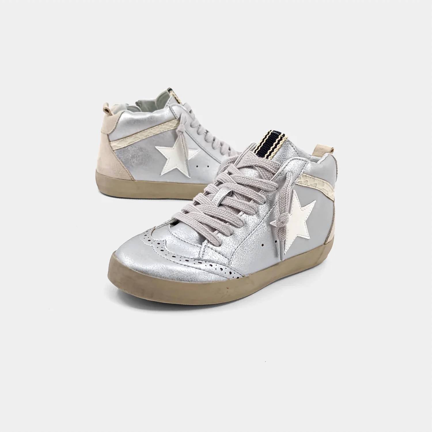 Stylish sneakers seamlessly combine vintage charm with contemporary flair. Crafted from high-quality faux leather and suede. Adorned with eye-catching metallic and feature the iconic star. Classic round toe design paired with a sturdy waffle rubber sole. Ensures that your child's comfort and durability are never compromised. Blending fashion and function in one enchanting package. Designed with little ones in mind, these sneakers are an essential for any kid who loves to shine.