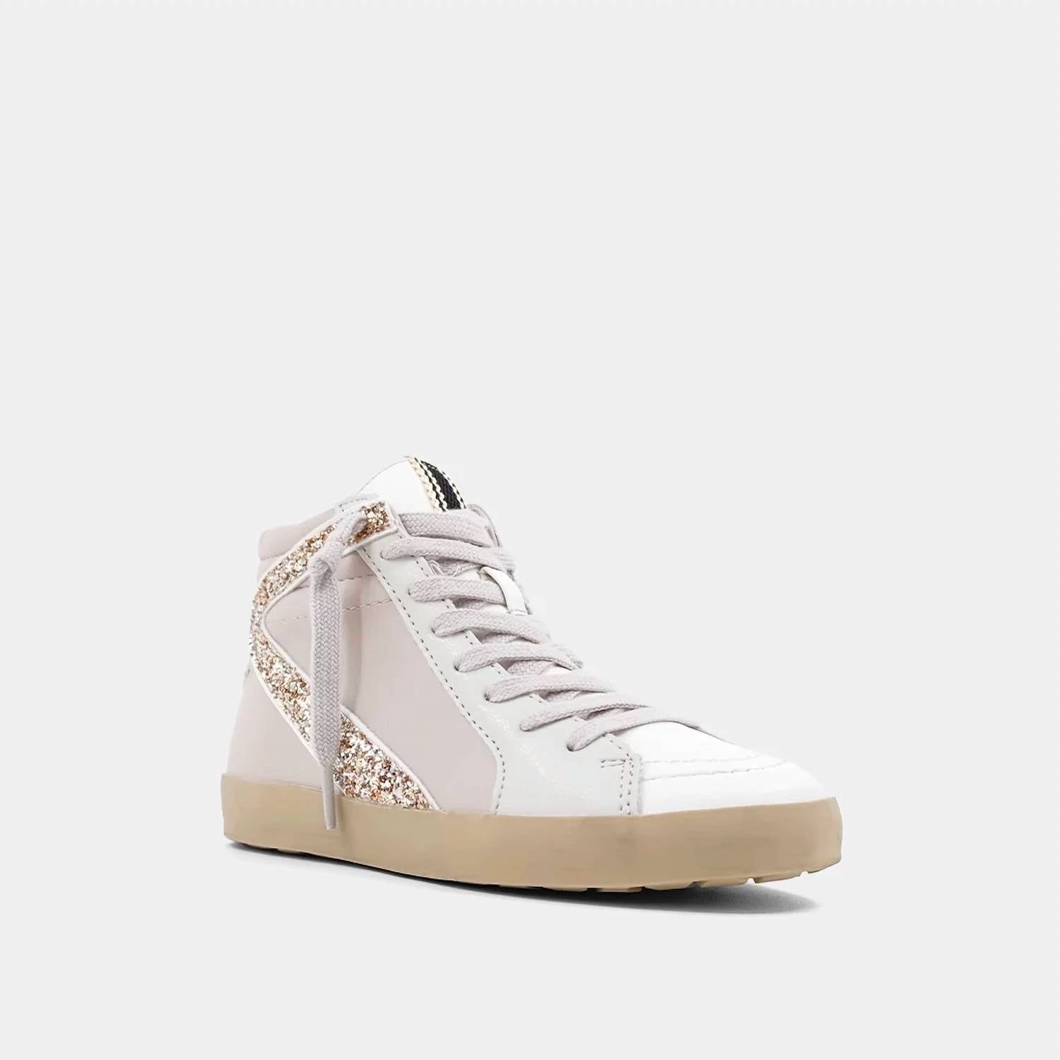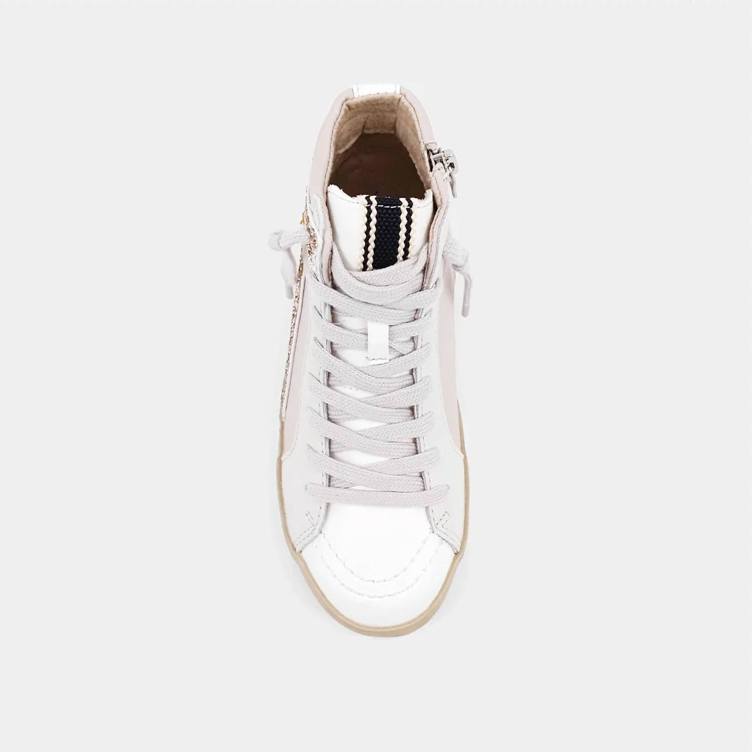 High-tops are designed to catch the eye with their playful yet chic appeal. Featuring a stunning, shining glittered faux leather and suede panel embellishments. Offer unmatched versatility and undeniable style. Elevate your kid's footwear with these cool kicks that fuse old-school charm with contemporary flair.