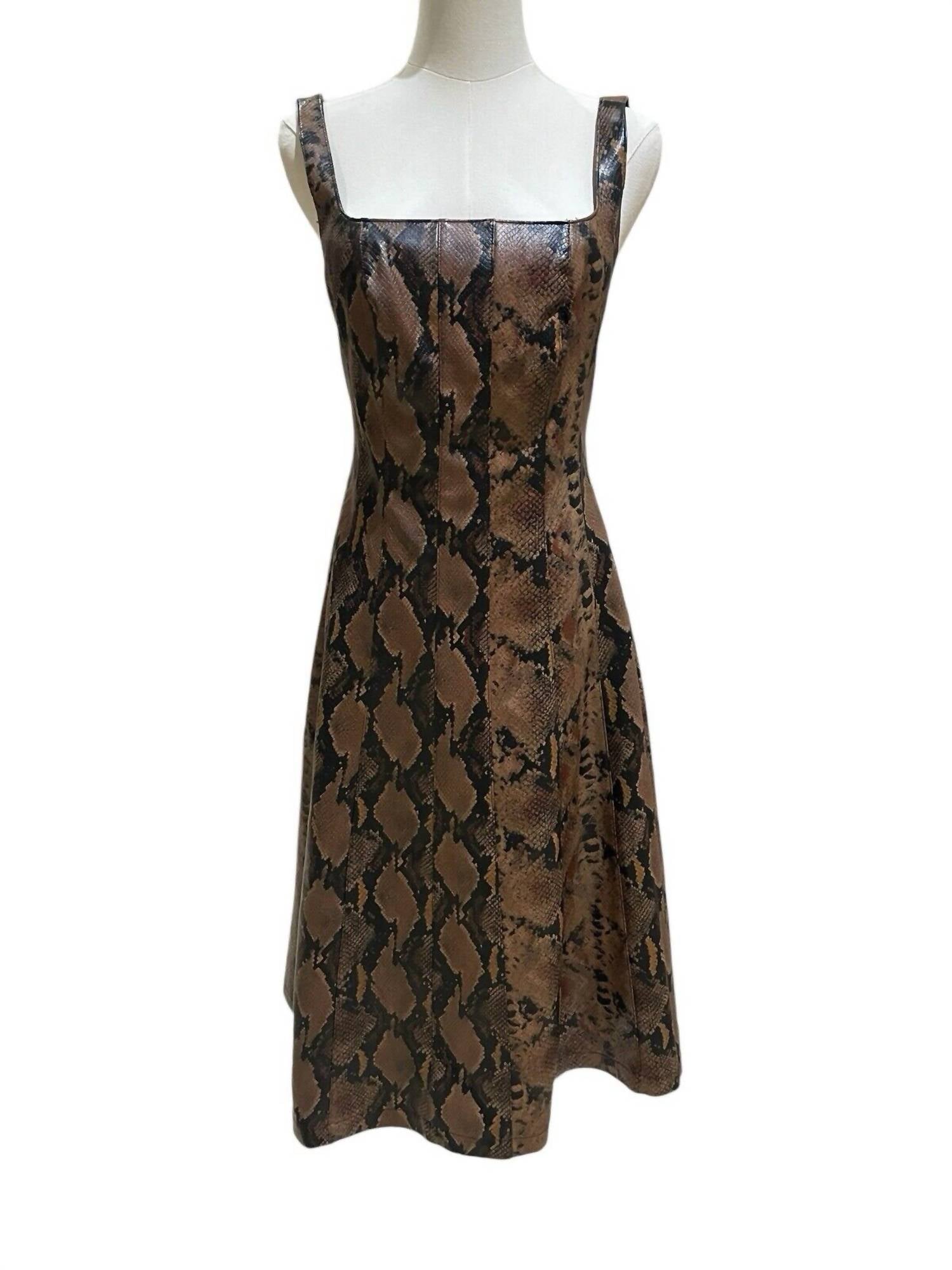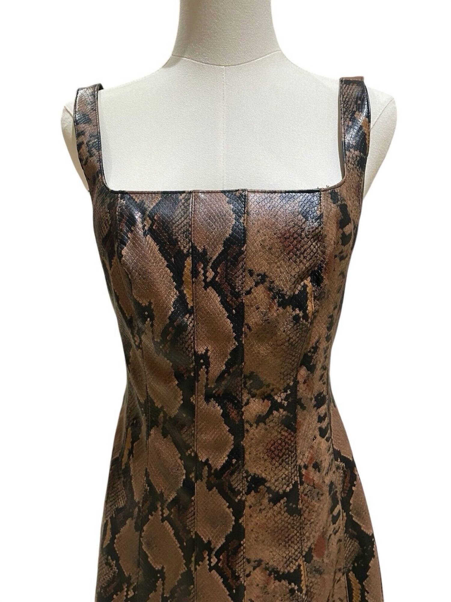 Embrace chic sophistication with the Snake Faux Leather Square Neck Sleeveless Midi Dress by 7 For All Mankind, crafted in a striking brown multi snake print. This A-line silhouette dress is composed of 100% Polyurethane with a soft 100% Polyester lining, offering a comfortable wear with a light stretch. Designed with a sleek sleeveless bodice, the dress features a square neckline and seamed detailing for a flattering fit. Length: 43.5" and tailored with precise measurements of a 16.5” chest and a 14” waist. Made easy with a hidden zip closure at the center back, care for it by washing inside out in cold water.