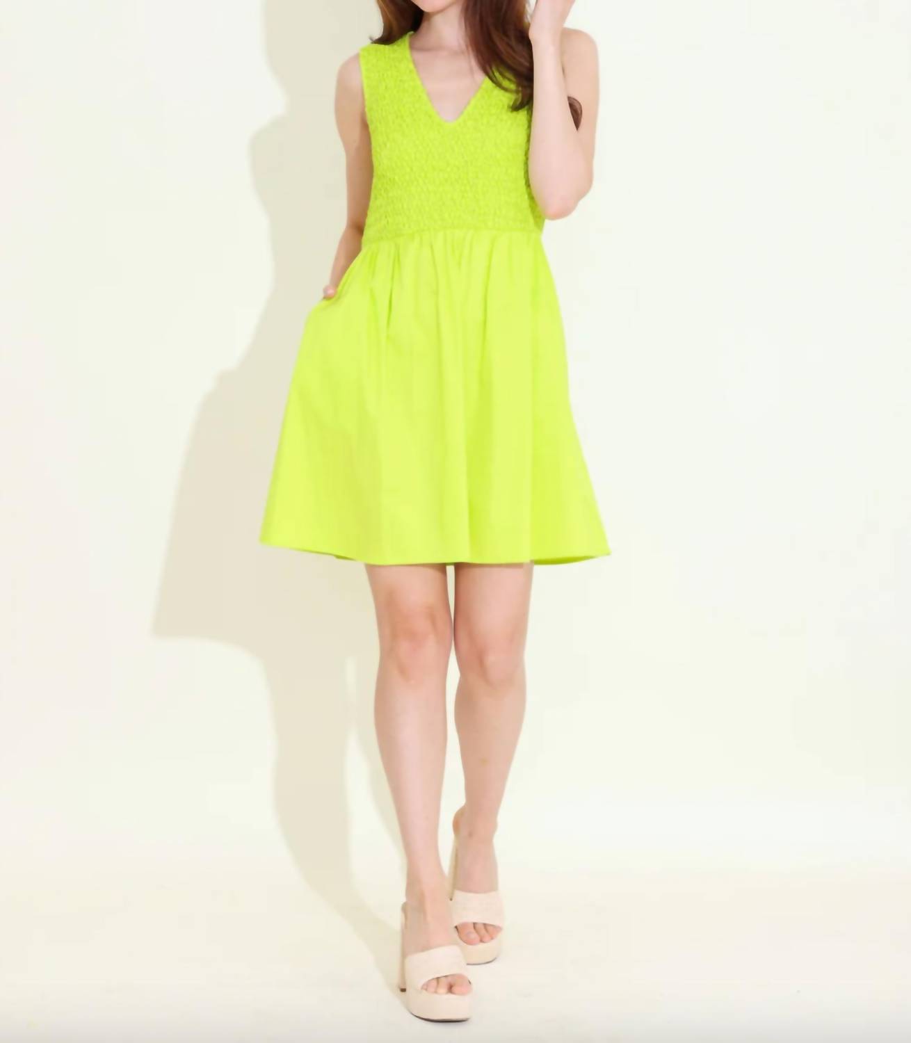 A short and breezy dress for those warmer days. The Hadley Dress by Alden Adair is a radiant choice for sunny beach days, crafted in a fresh citrus hue. This women's sleeveless mini dress flaunts a textured, fit-and-flare silhouette with a flattering V-neckline, embodying a minimalist trend perfect for summer. Convenient pockets add practicality, while you can easily maintain this piece with machine wash and lay flat to dry instructions. Designed for a carefree and stylish look, it's an excellent addition to your seasonal wardrobe.