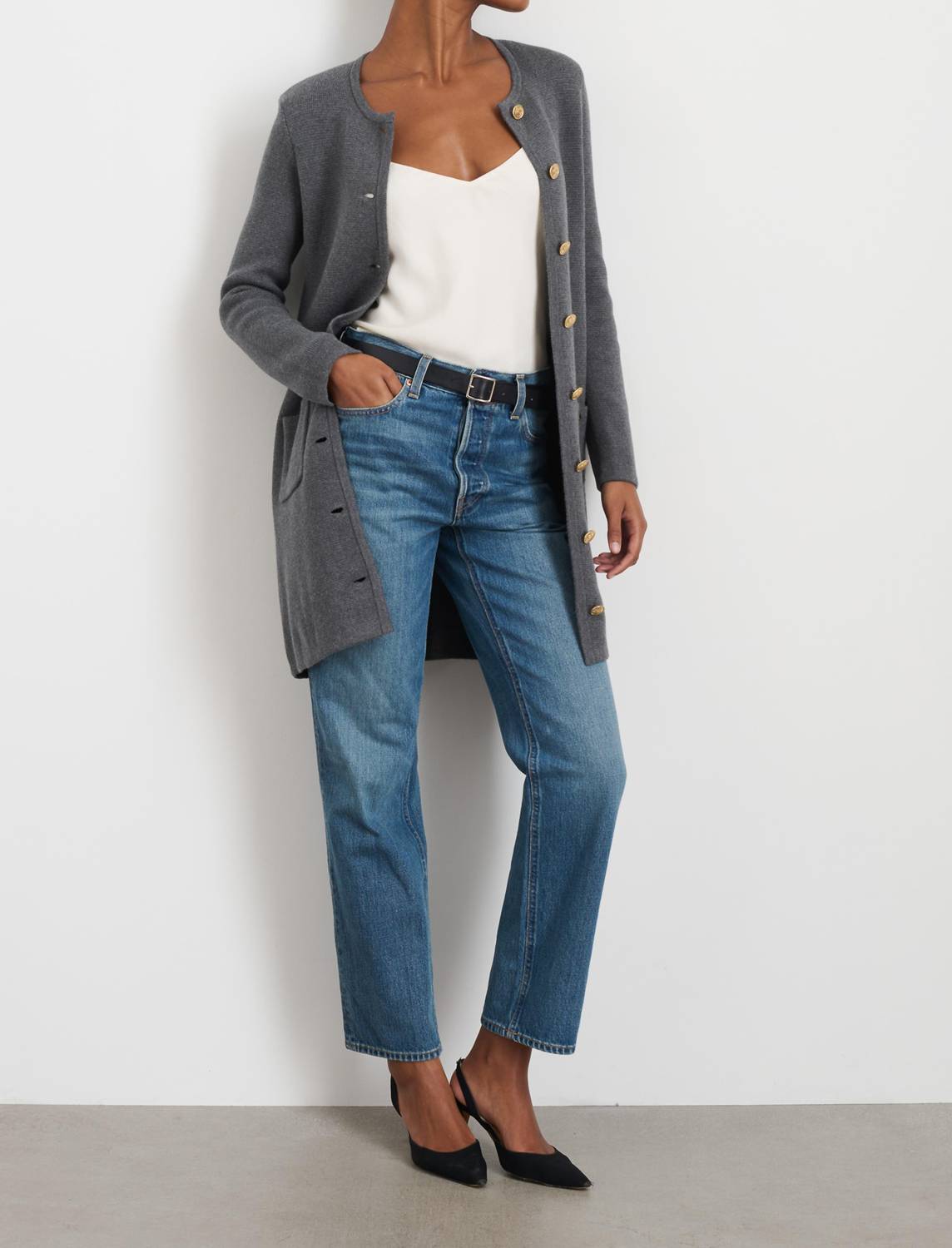 Introducing the Stella Long Sleeve Cotton & Cashmere Knit Mini Dress by ALEX MILL, a chic and versatile piece in Heather Grey. This sophisticated style staple features long sleeves and a classic crewneck, crafted from a 95% cotton, 5% cashmere blend that drapes elegantly with its 33" length. Designed with a textured pattern and front patch pockets, it seamlessly transitions from a minidress to a longline cardigan with button closure versatility. Imported with care instructions for hand washing and laying flat to dry, this dress is an ideal choice for a 90s fashion-inspired dinner party look.