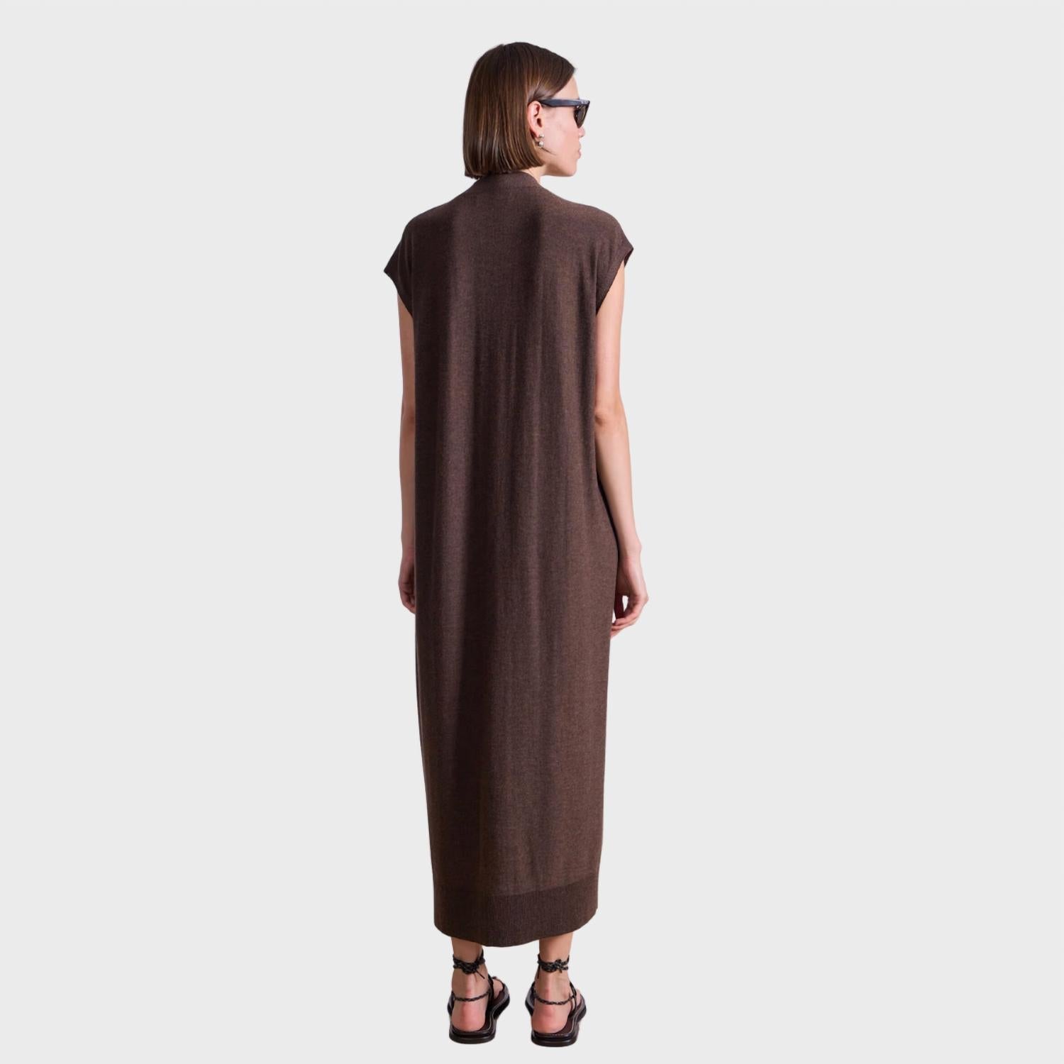 The perfect length dress does exist. Presenting the Olana Knit Midi Dress by APIECE APART, a perfect wardrobe addition in a rich Espresso hue. This sleeveless, V-neck dress features a shift silhouette and midi length of 49 inches, offering an option to cinch the waist with an extra button loop for a casually elegant fit. Crafted from 55% Extrafine Merino and 45% Cotton, this lightweight piece effortlessly transitions through seasons. Button closure. Dry clean only. The model, standing at 5'10", is wearing a size small.