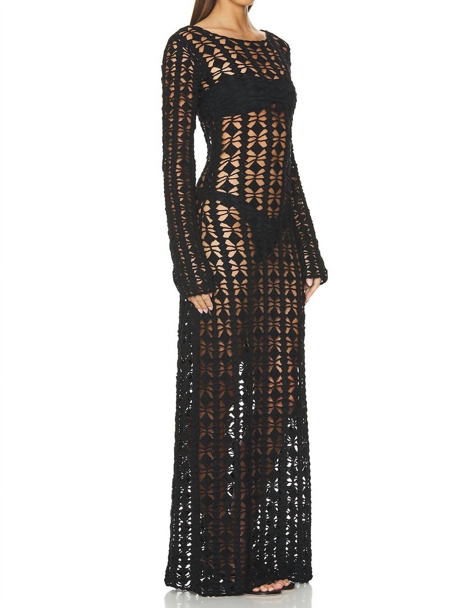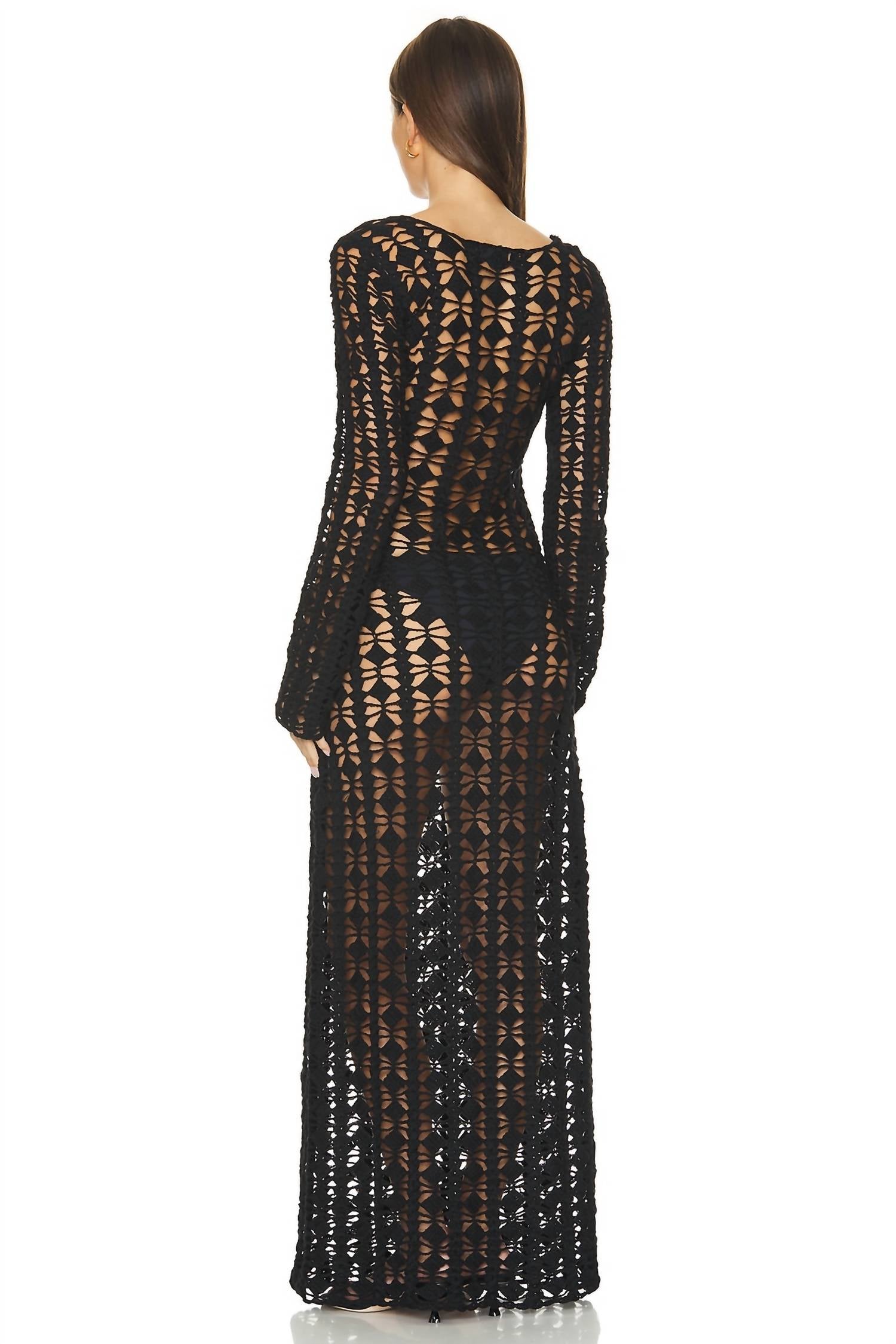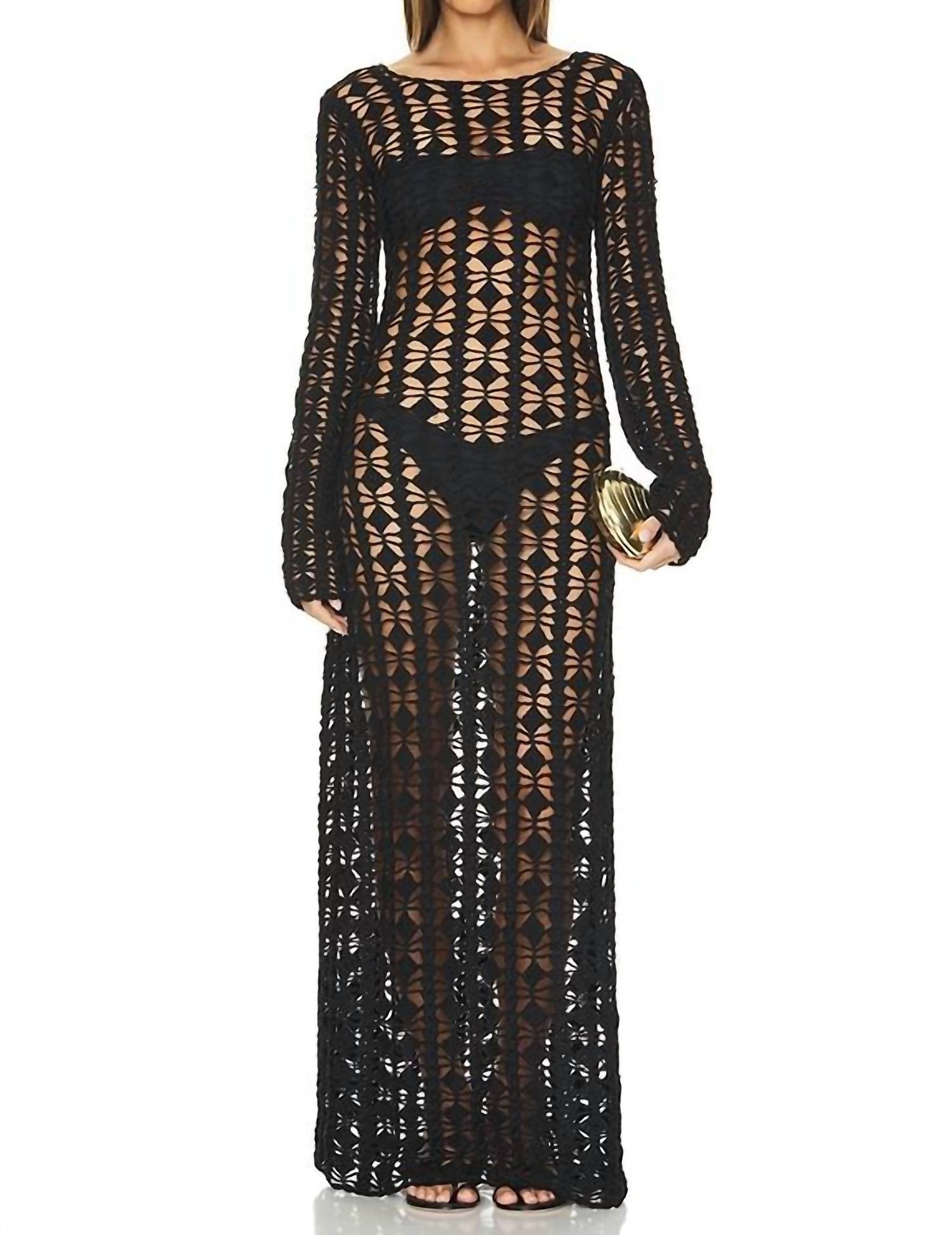 Style this maxi with your favorite statement necklace and sandals for the perfect look. Experience the elegance of the Ariana Crochet Maxi Dress by Beach Riot, perfect for your next evening event. This sheath dress is crafted from 100% cotton, featuring a textured open-knit design with geometric shapes and a flattering slim-fitting silhouette. Designed with long sleeves and a classic crewneck, this dress offers both style and comfort. Closure: Pull-on design. Care: Hand wash. Available in chic black, ideal for spring occasions.