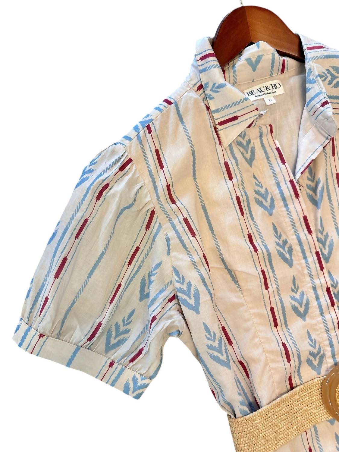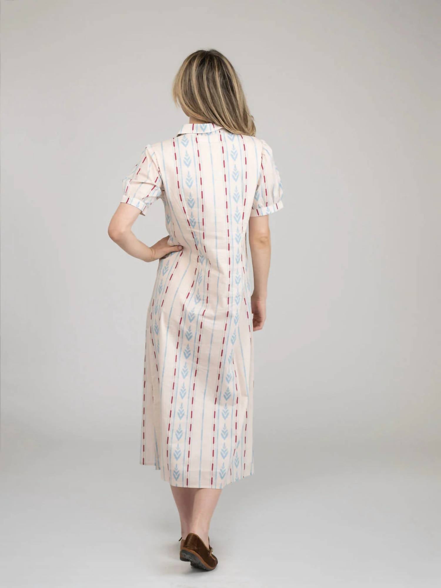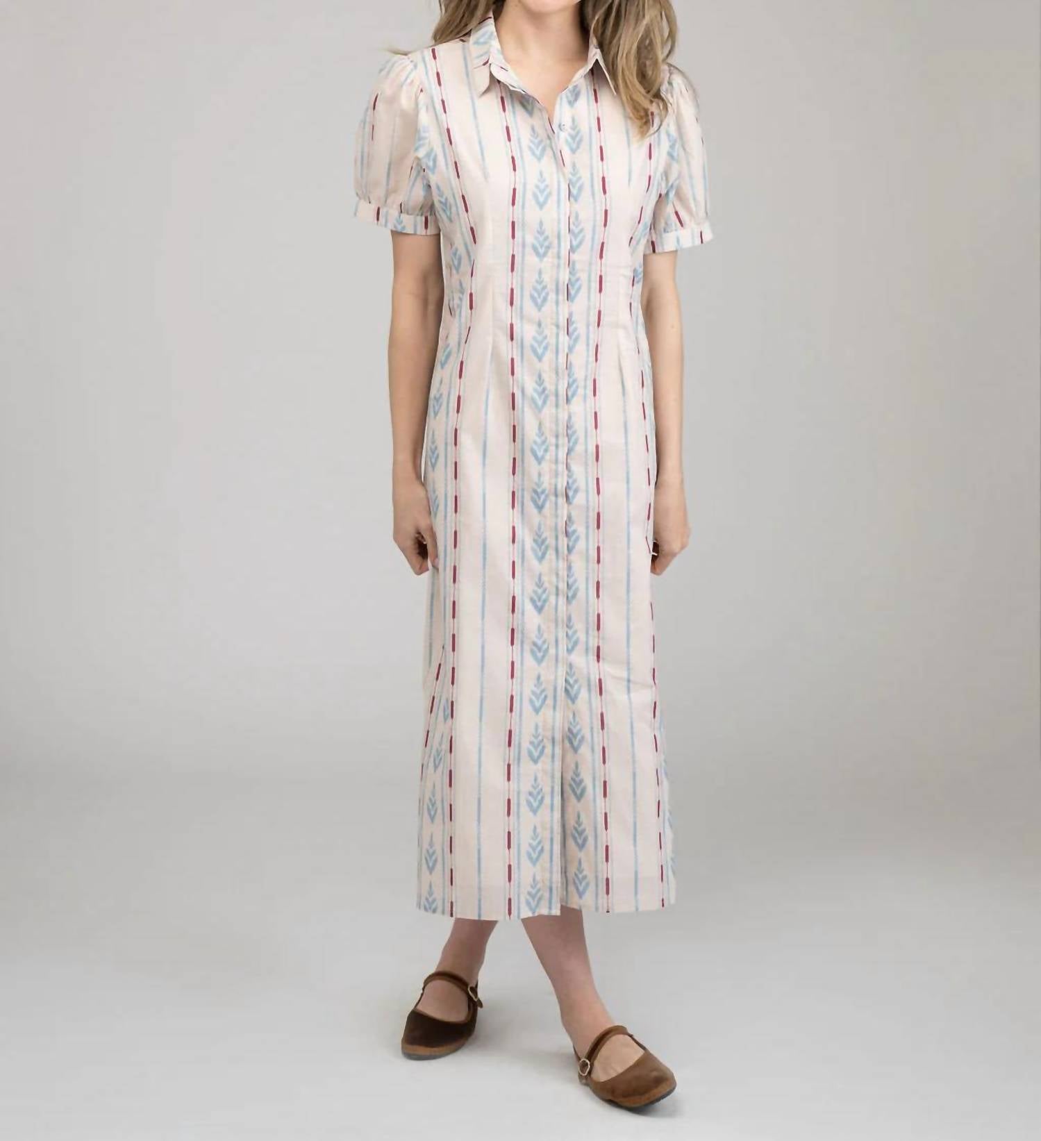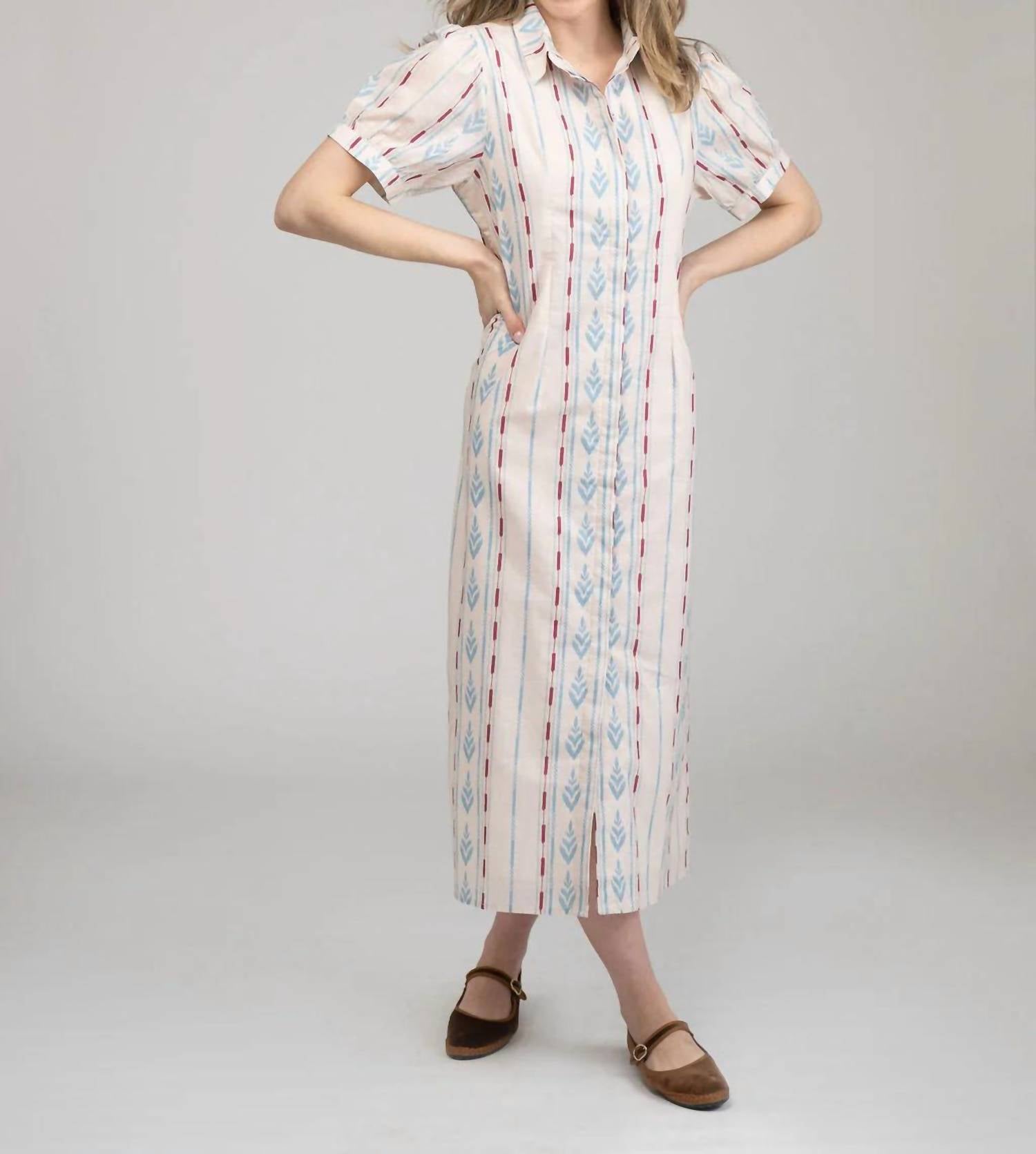 Introducing the Kris Ikat Stripe Maxi Dress by Beau & Ro, a chic choice for your summer wardrobe. This dress showcases elegant short puff sleeves with elastic cuffs and a collared neckline, offering a classic shift silhouette. Made from 100% breathable cotton, it features a stylish patterned design in ivory. Closure: Button closure. Care: Machine wash, line dry. Perfect for evening events, this dress channels a 90s fashion vibe, ideal for a 4th of July celebration.
