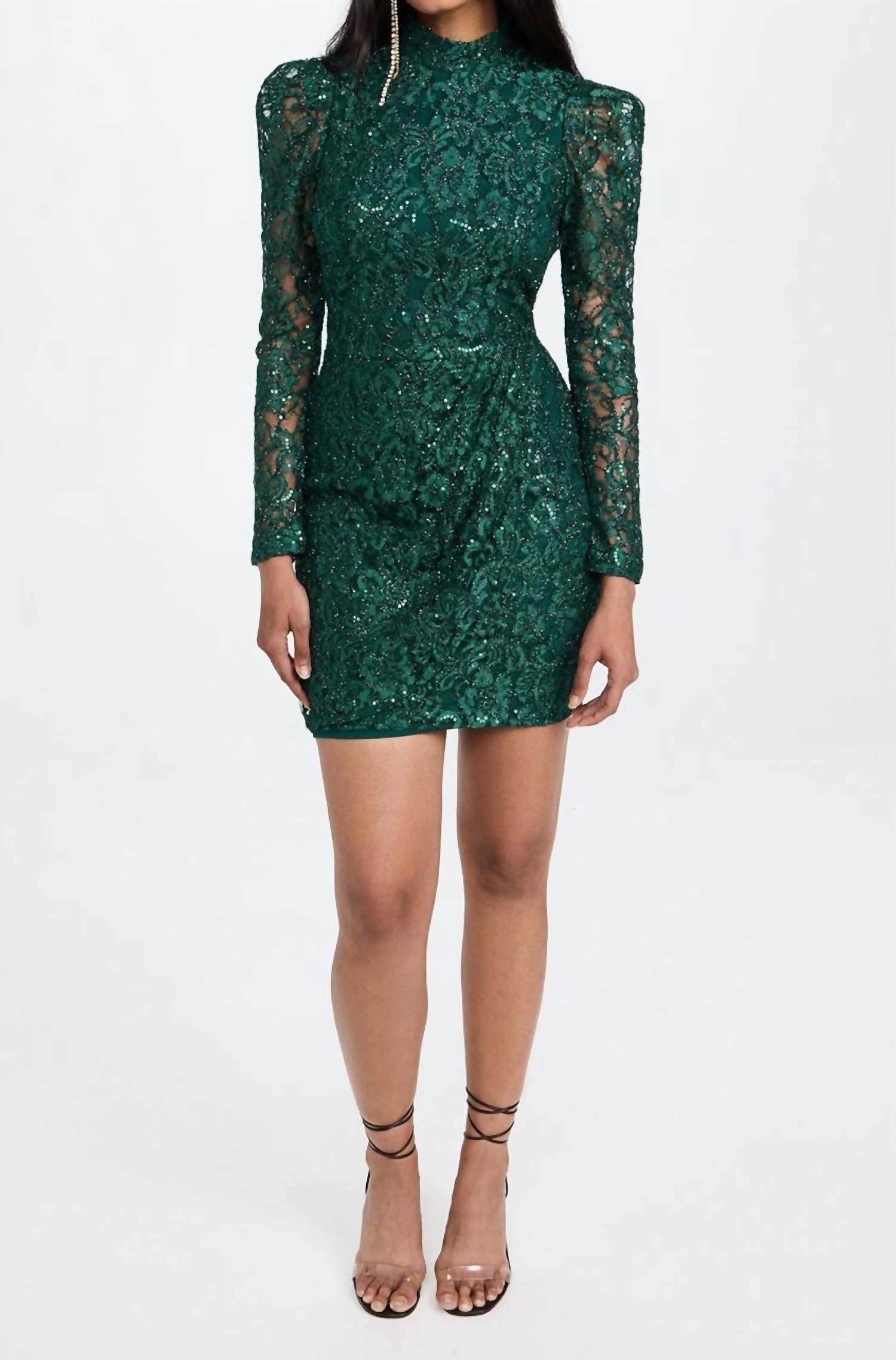 The kind of easy and flattering dress you'll be reaching for all season long. Step into elegance with the Santorini Lace Sequin Long Sleeve Mini Dress by Black Halo, perfect for any evening event. This stunning sheath dress in Jungle Gem features long sleeves with puff shoulders and a chic mock neckline, adorned with allover sequin embellishments. Crafted from a luxurious blend of 44% rayon, 36% polyamide, and 20% nylon, the garment measures 33 inches in length and incorporates a hidden zip closure at the back. Made in the USA with imported materials, it is best maintained through dry cleaning to preserve its intricate design.