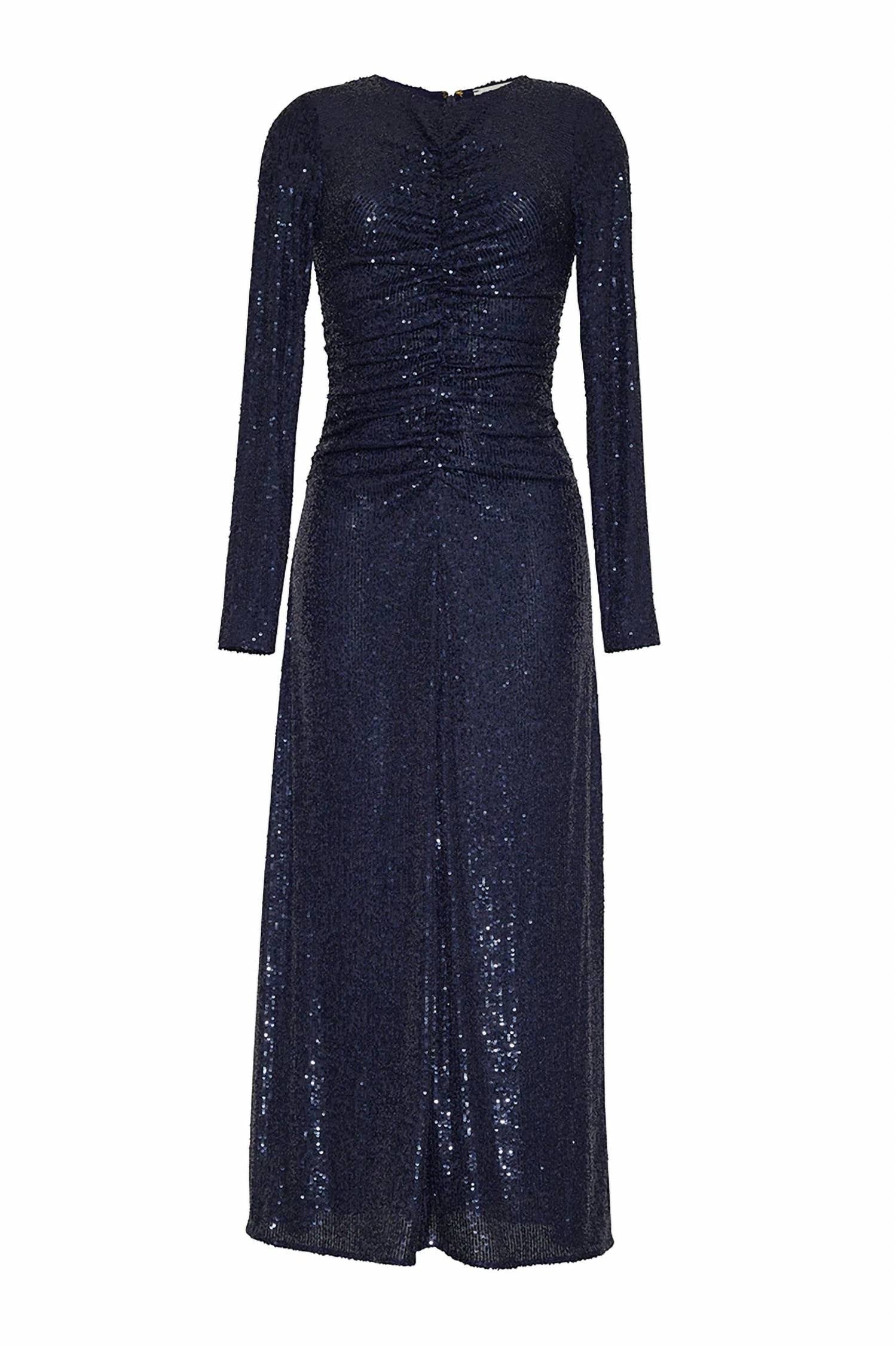 The pefect long sleeve dress for those cooler months. Stylish long sleeves and a flattering A-line silhouette. Crafted from 100% polyester with a poly mesh lining and sequin embellishments. Chic garment in Midnight Sequins. Ensures elegance and comfort. Invisible back zip with hook-and-eye. Dry clean only or hand wash cold. Made in China.