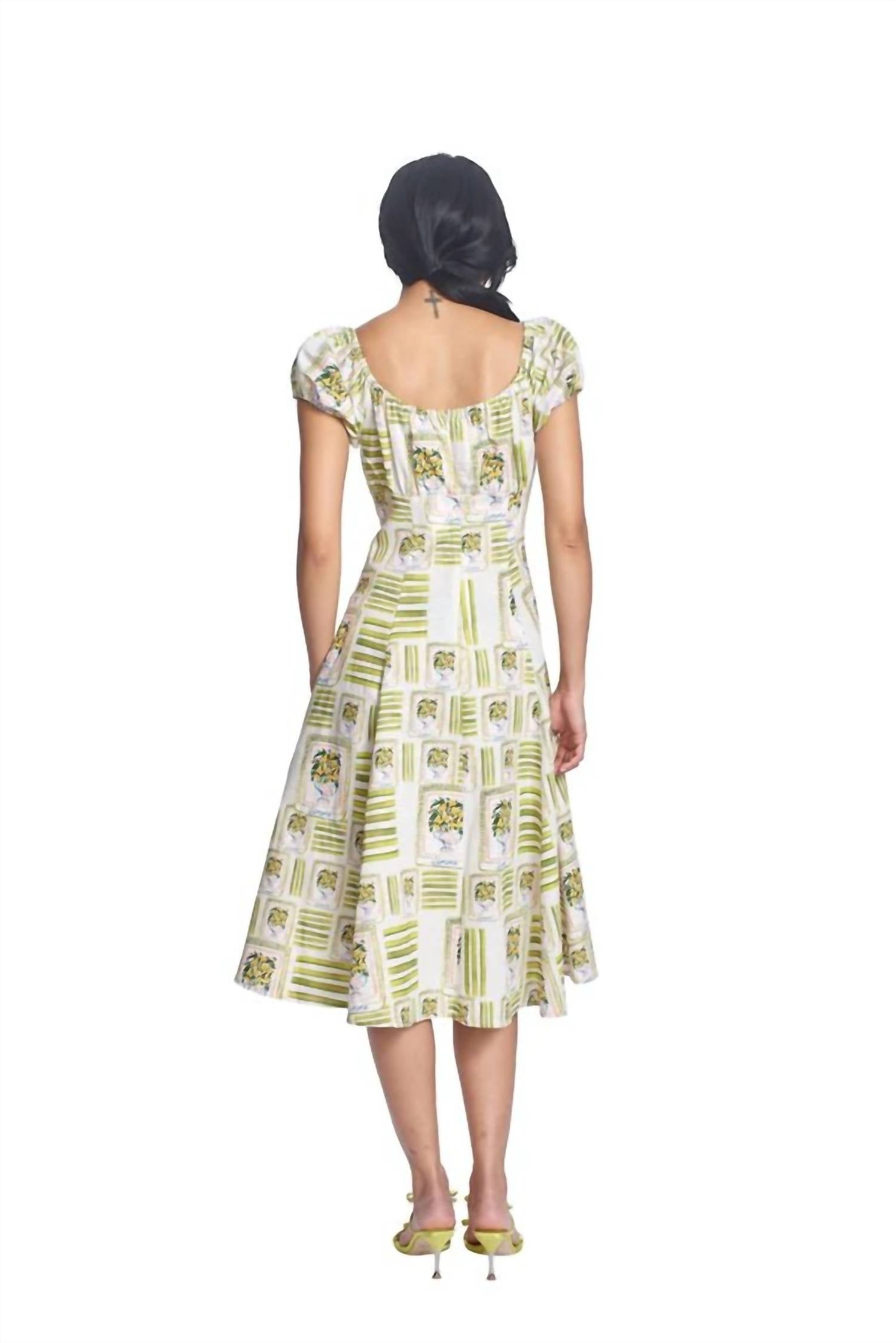 Introducing the Cordelia Midi Dress by Corey Lynn Calter, a stunning lemon-hued piece perfect for vacation-ready style. Featuring short sleeves and an A-line silhouette, this dress is crafted from55% Cotton and 45% Linen for comfort and elegance. Designed with a scoop neckline, it offers a patterned maximalist look for any summer occasion. Closure: Zip closure. Care: Hand wash in cold or lukewarm water using a gentle, mild detergent . Alternatively, machine wash on a delicate cycle in cold or lukewarm water