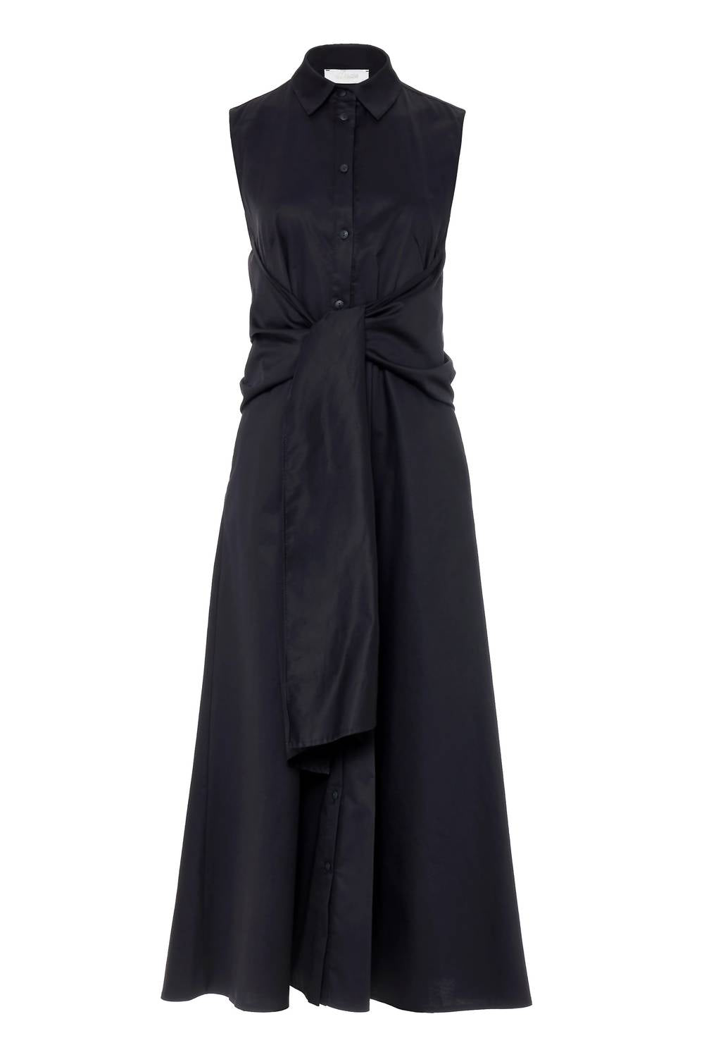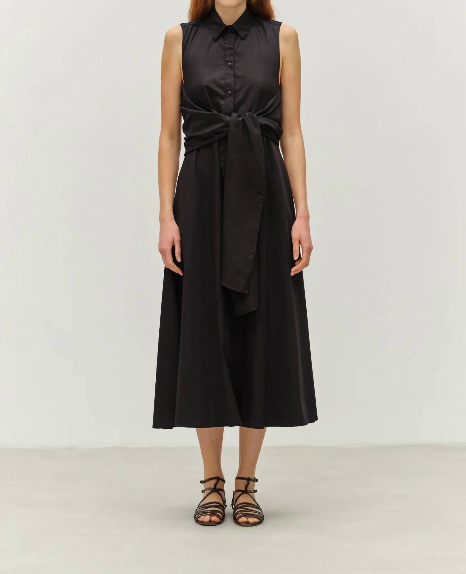 The perfect length dress does exist. The Eros Sleeveless Shirt Dress by Devotion Twins is a stunning addition to any wardrobe, perfect for a dinner party or summer outing. Fashioned from 100% cotton, this midi dress boasts a solid black color and features a collar neckline with a chic button closure. Designed with a tie waist for a flattering fit, it includes practical pockets for added convenience. Handcrafted with quiet luxury in mind, this piece offers a classic silhouette with measurements for size "S" including a length of 129cm front and 132cm back. Care instructions: Machine wash. Model is 180cm/5'9" wearing a size S.