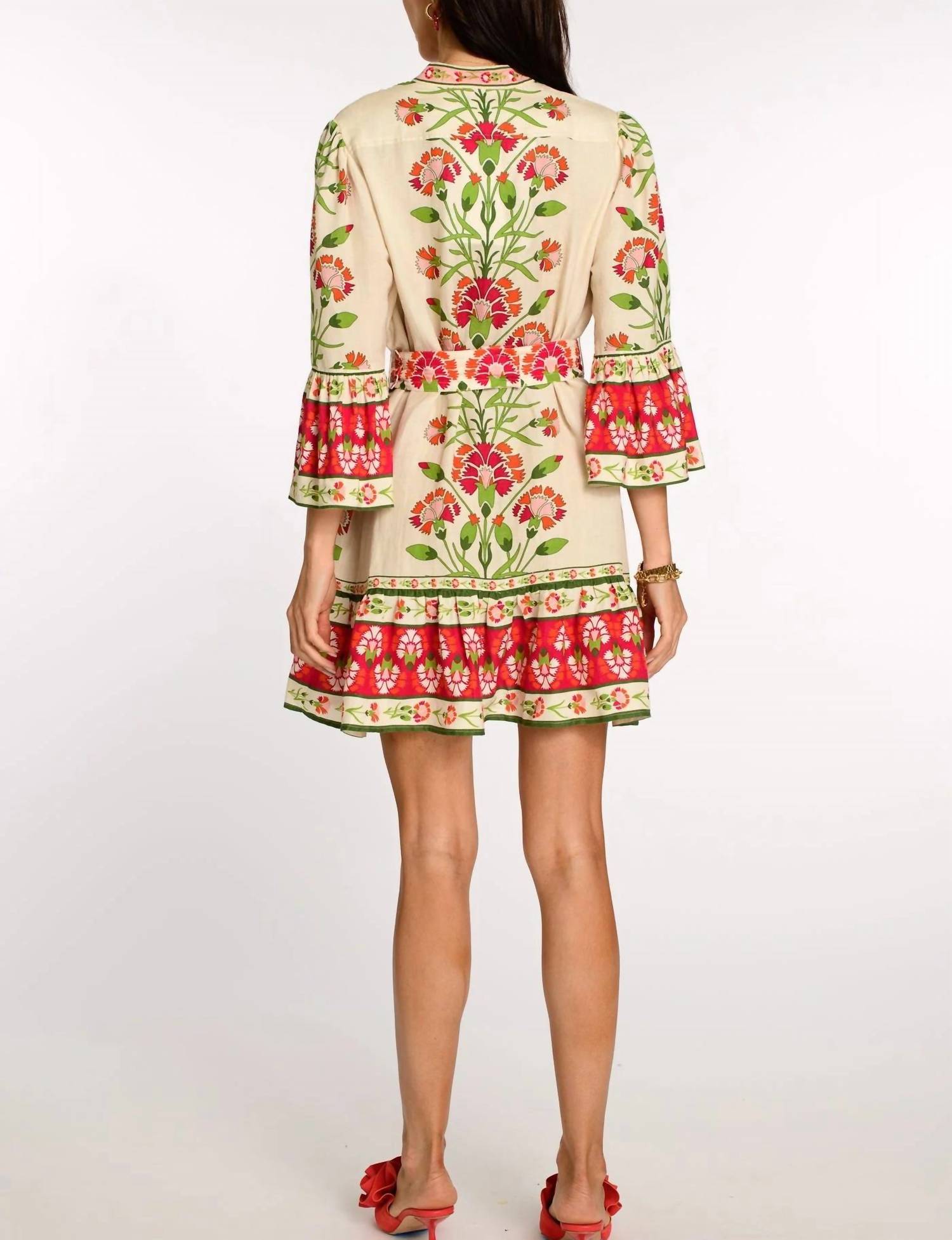 Introducing the Frances Dress by Elizabeth James The Label, a chic addition to your wardrobe in the Indian Flower Ivory pattern. This dress features elbow-length flutter sleeves and is crafted from viscose linen, offering both comfort and style with its sophisticated shirt silhouette. It includes a tailored button front with a covered placket, optional belt, and charming ruffle hem for versatile elegance. Care instructions advise machine washing on a cold, gentle cycle and line drying with the option of a warm iron. Model is 5'9" and is wearing a size XS.