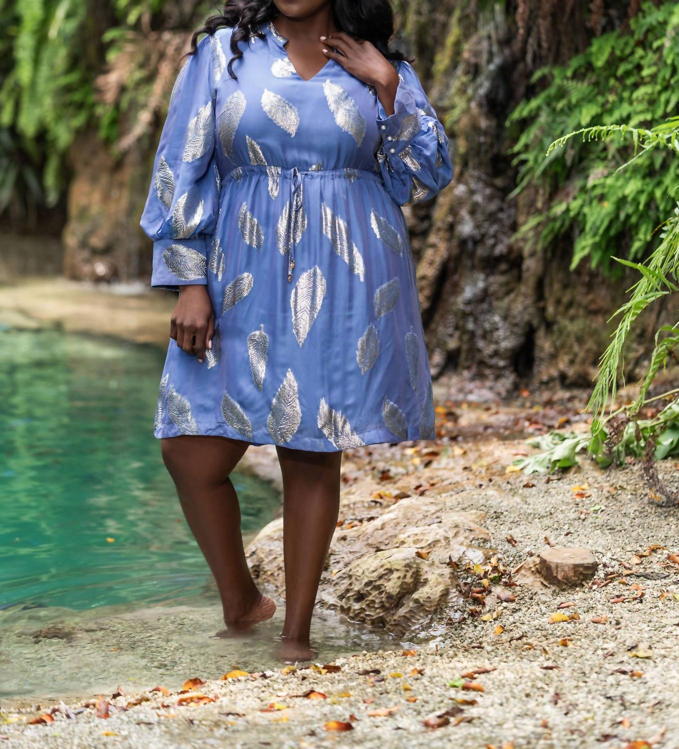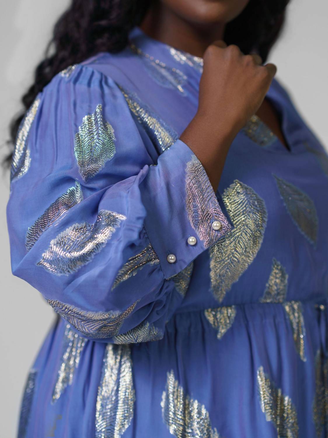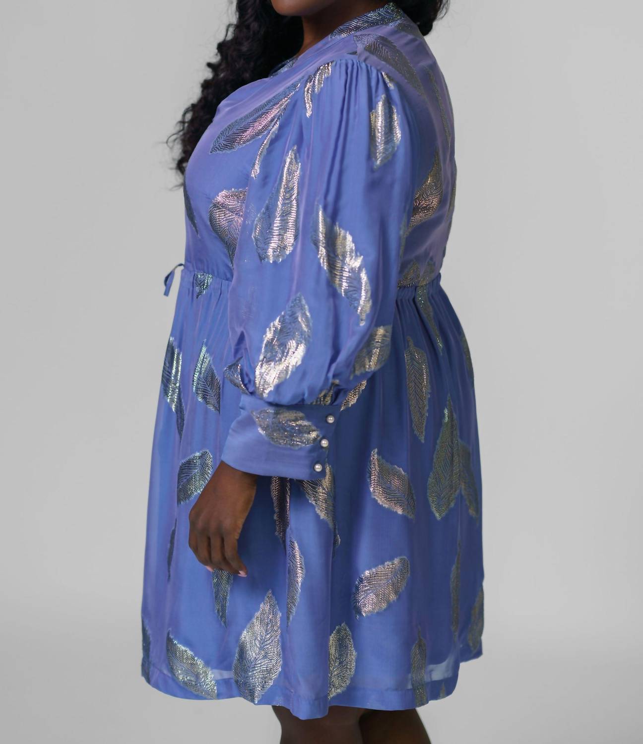Presenting the Noureen V-neck Mini Dress by EMILY LOVELOCK in exquisite Galactic Blue, perfect for your spring wardrobe. With long, voluminous sleeves and a metallic leaf design, this dress is made from 35% Silk 35% Viscose 30% Lurex. It features a flattering above-the-knee length and is highlighted by a tie-up waist and broad cuffs with pearl buttons. The dress offers a pull-on closure and should be dry cleaned to maintain its elegance.