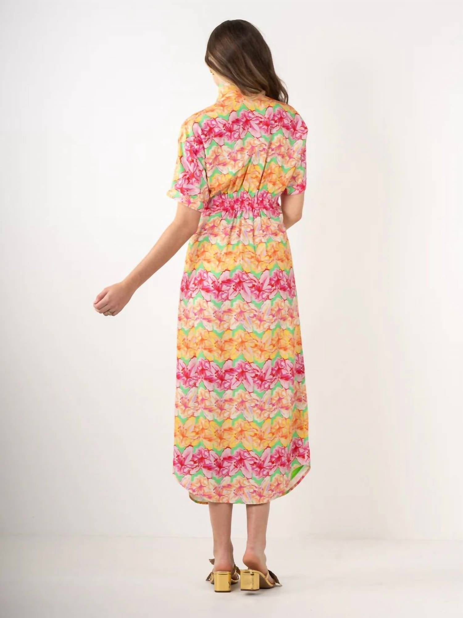 Just add slides or mules and you are good to go. Discover the Georgia Short Dolman Sleeves Dress by Emily McCarthy, a vibrant floral statement piece perfect for spring occasions. This women's midi dress features short dolman sleeves and a stylish mockneck, crafted from a blend of 70% rayon and 30% linen with a 100% polyester lining. It boasts an elegant sheath silhouette enhanced by a tailored bodice with pin tucks and an elastic cinched back waist for a flattering fit. Closure: Signature gold button closure. Care: Dry-clean only, spot clean with cold water, test cleaning solutions for reactions.