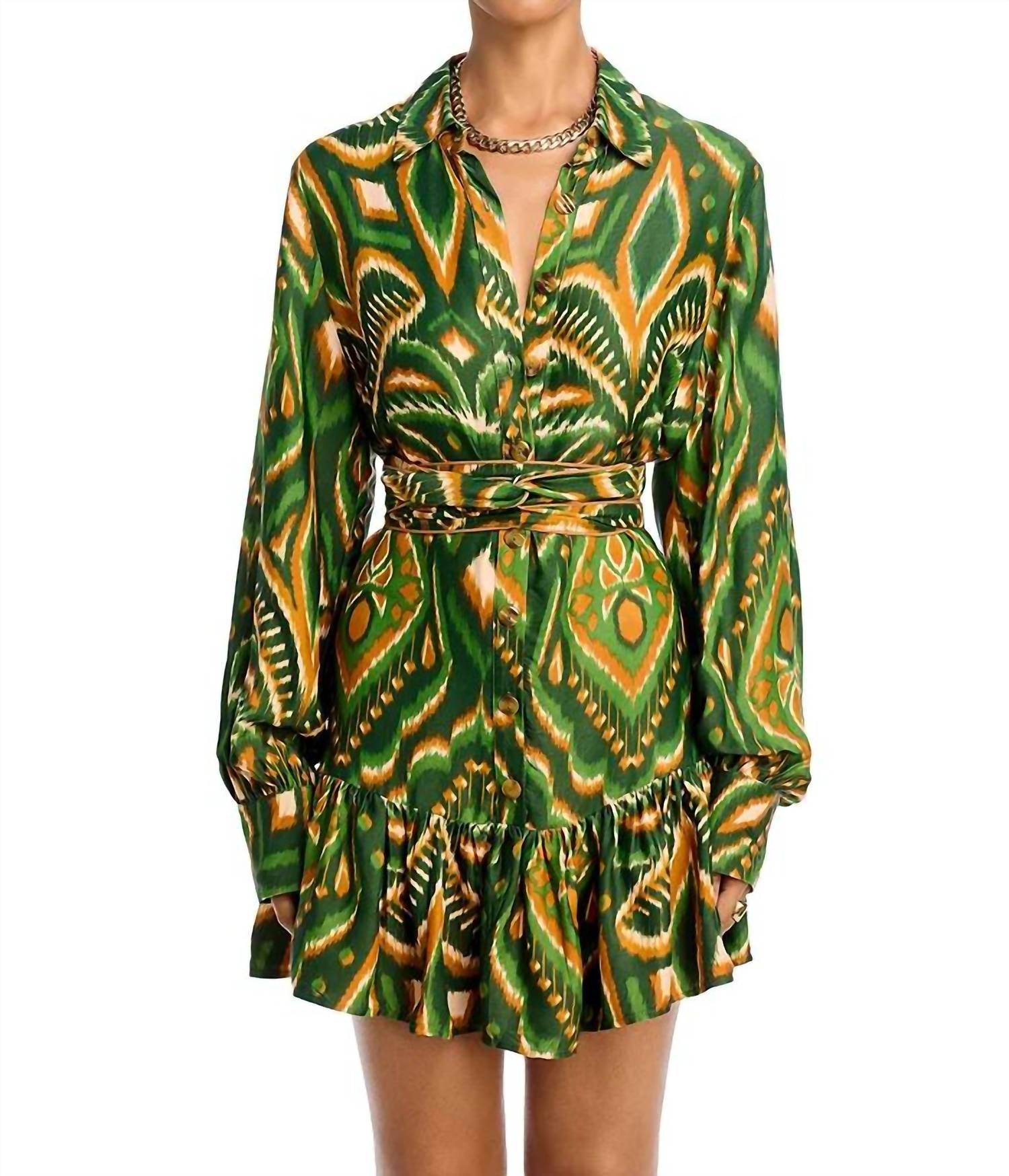 A short and breezy dress for those warmer days. Experience the vibrant allure of the Pineapple Ikat Mini Dress by FARM RIO, an elegant addition to your spring wardrobe with a Boho Chic flair. Crafted from 100% cotton, this dress features long sleeves and a classic button closure. The dress is adorned with a geometric pattern and a self-tie belt that enhances the waistline, while a charming ruffle hem adds a playful touch. For best care, hand wash and lay flat to dry. Perfect for occasions like Thanksgiving or birthdays.