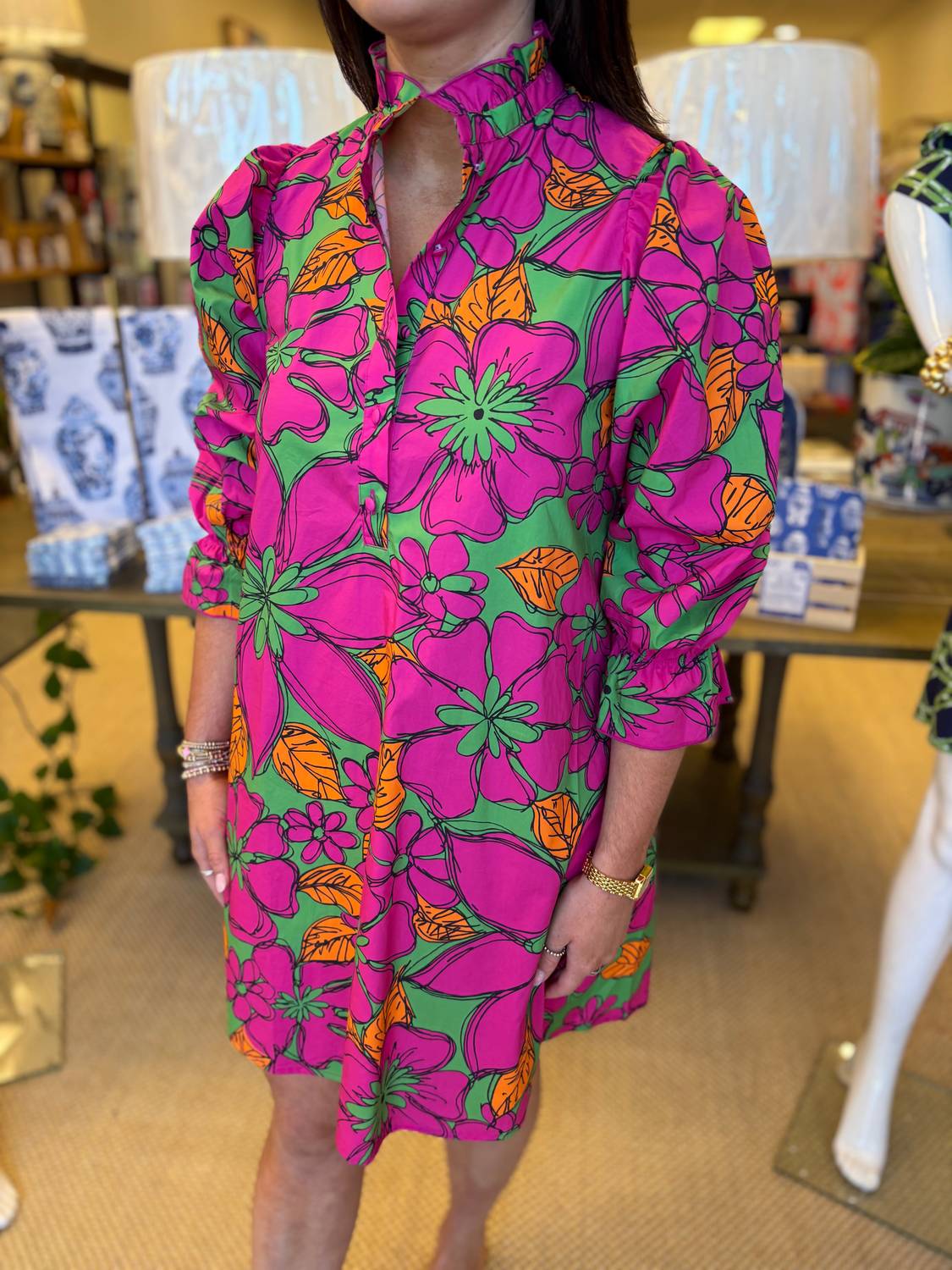 A short and breezy dress for those warmer days. Elevate your spring wardrobe with the Adelina Bloom Dress by Flora Bea, a delightful mini dress in a chic floral pattern. Tailored for workwear versatility, this shirt dress features three-quarter sleeves and a collared neckline. Made from pure cotton, the dress ensures comfort and breathability, perfect for Easter or any holiday party. Closure: Button closure. Care: Hand wash and line dry.