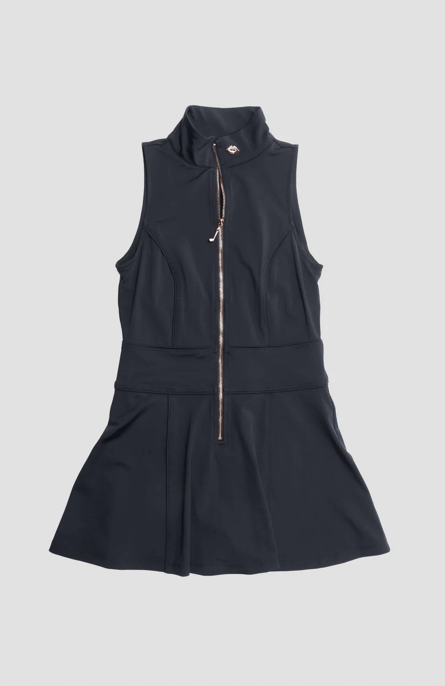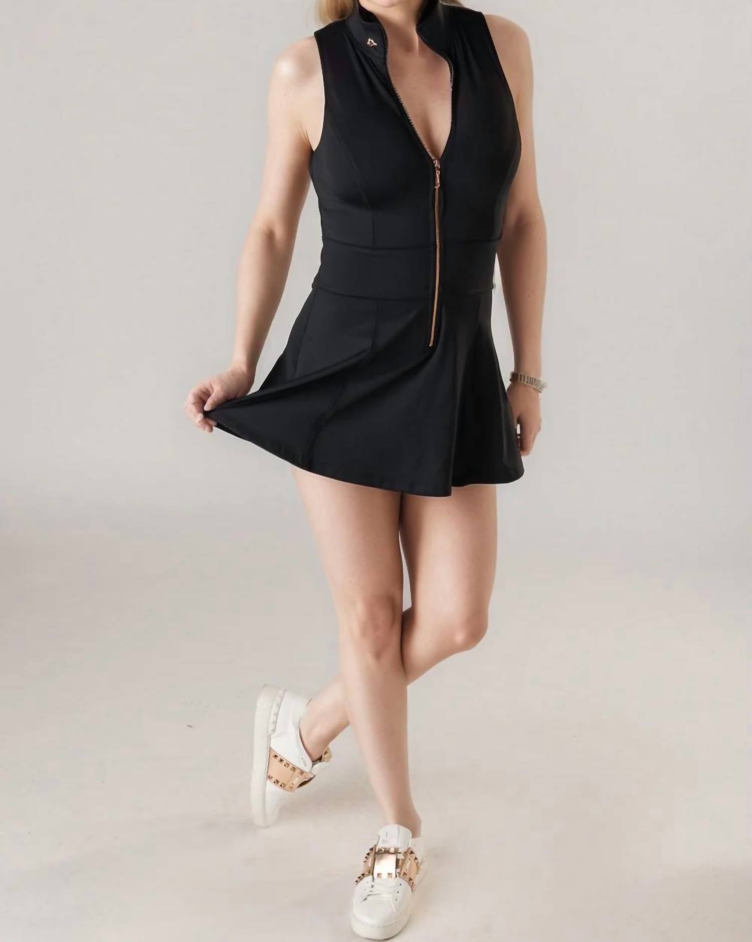 The perfect mini dress for those warmer months. Elevate your game with the chic addition to your sports wardrobe. Crafted from 78% recycled polyester and 22% elastane, offers comfort and style with its A-line silhouette and contour-enhancing fit. Made in US with Italian fabric. Features a zip front neckline and built-in shorts with pockets for convenience, along with a built-in shelf bra for support. Machine wash warm and lay flat to dry, ensuring this piece remains a staple for spring fitness and athleisure activities.