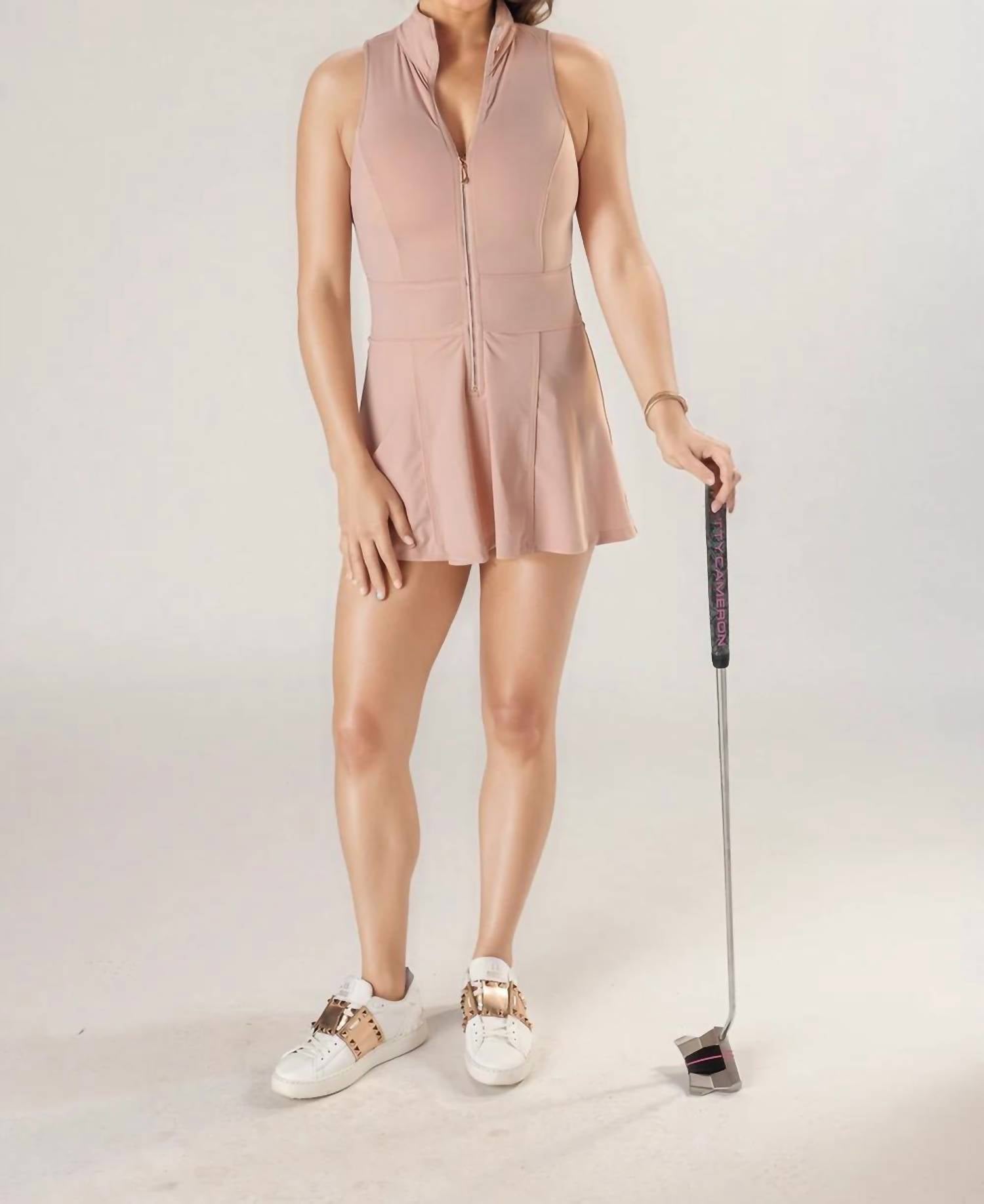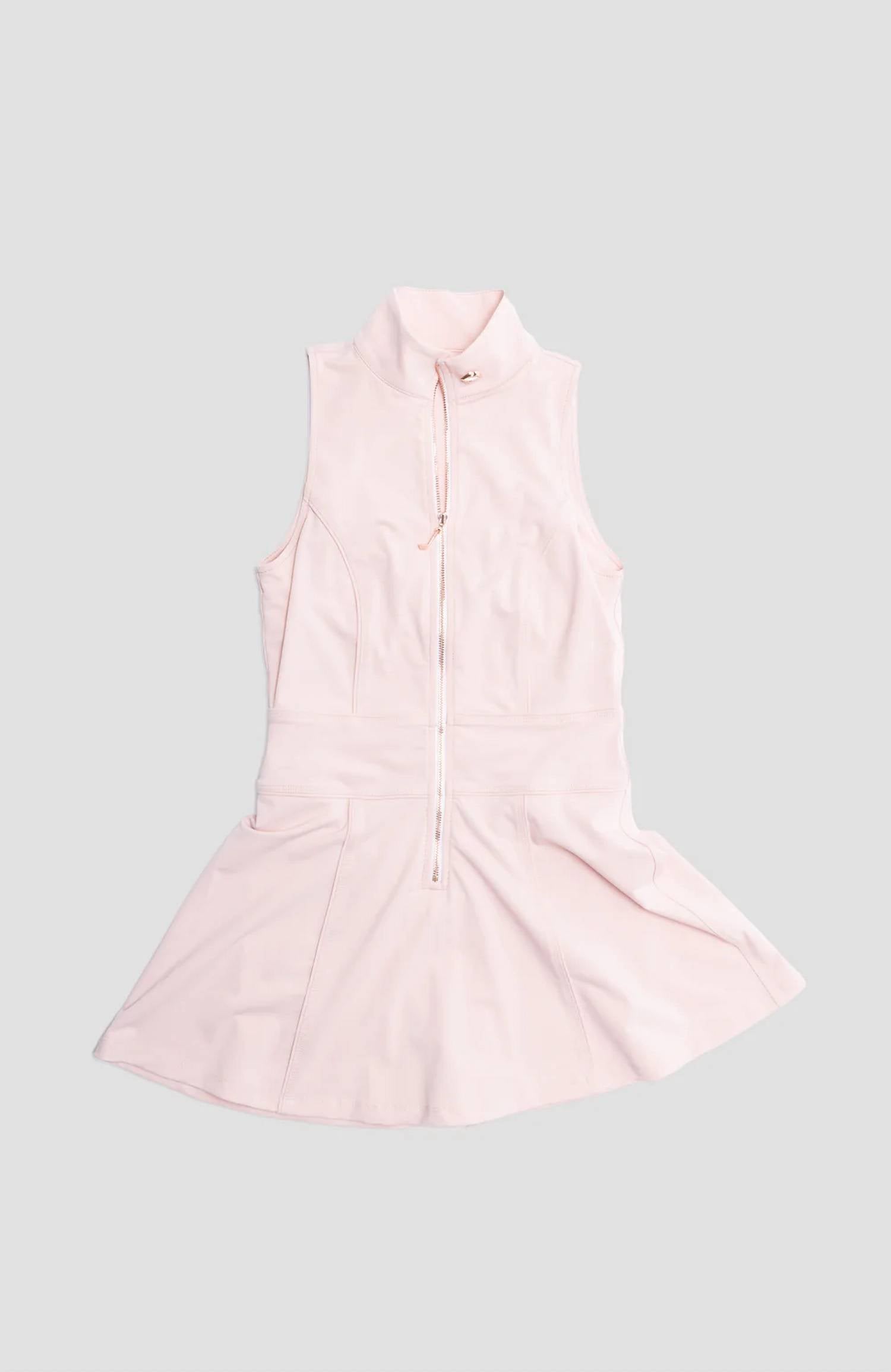 The kind of easy and flattering dress you'll be reaching for all season long. Elevate your game with the chic addition to your sports wardrobe. Crafted from 78% recycled polyester and 22% elastane, offers comfort and style with its A-line silhouette and contour-enhancing fit. Made in US with Italian fabric. Features a zip front neckline and built-in shorts with pockets for convenience, along with a built-in shelf bra for support. Machine wash warm and lay flat to dry, ensuring this piece remains a staple for spring fitness and athleisure activities.