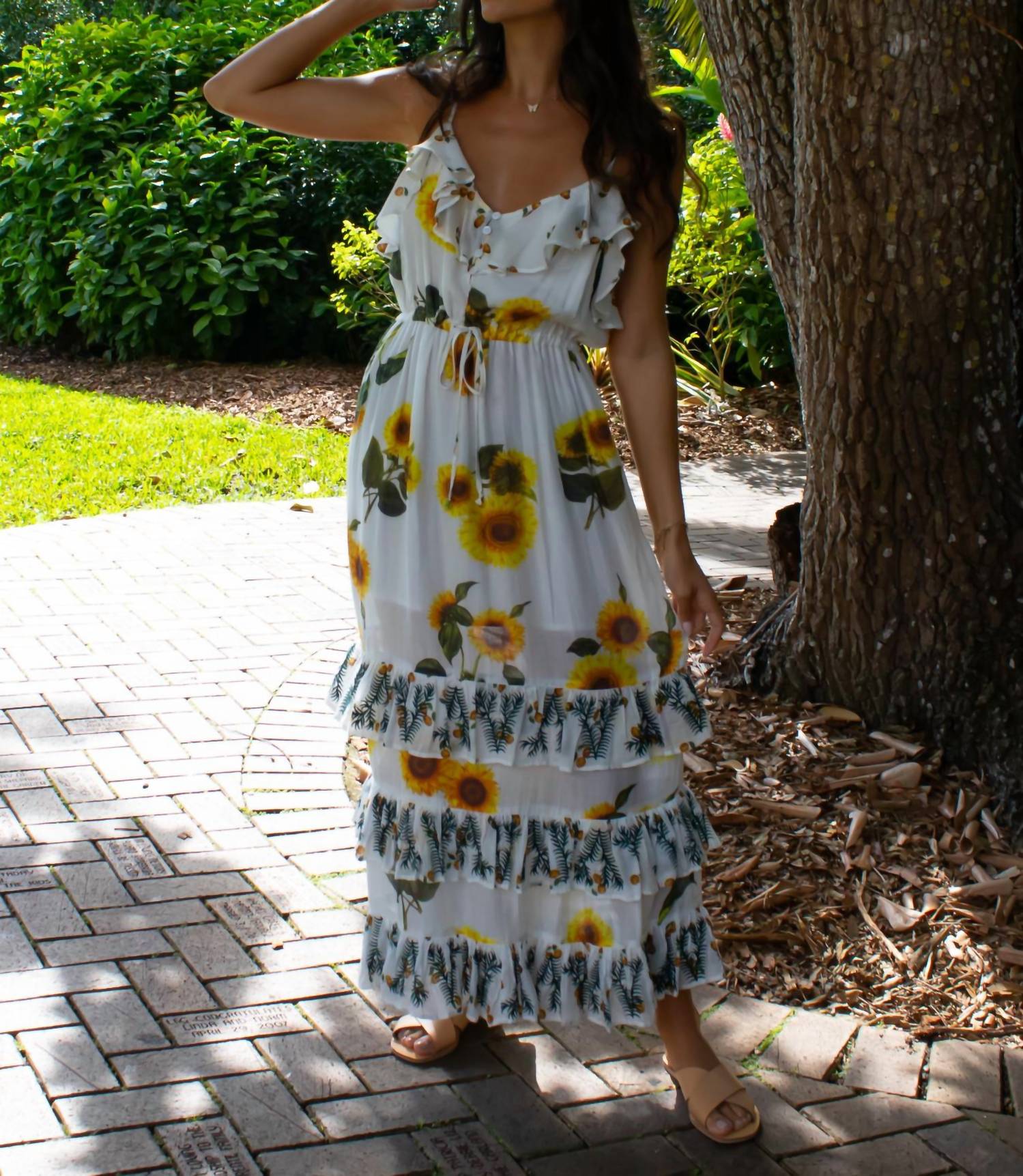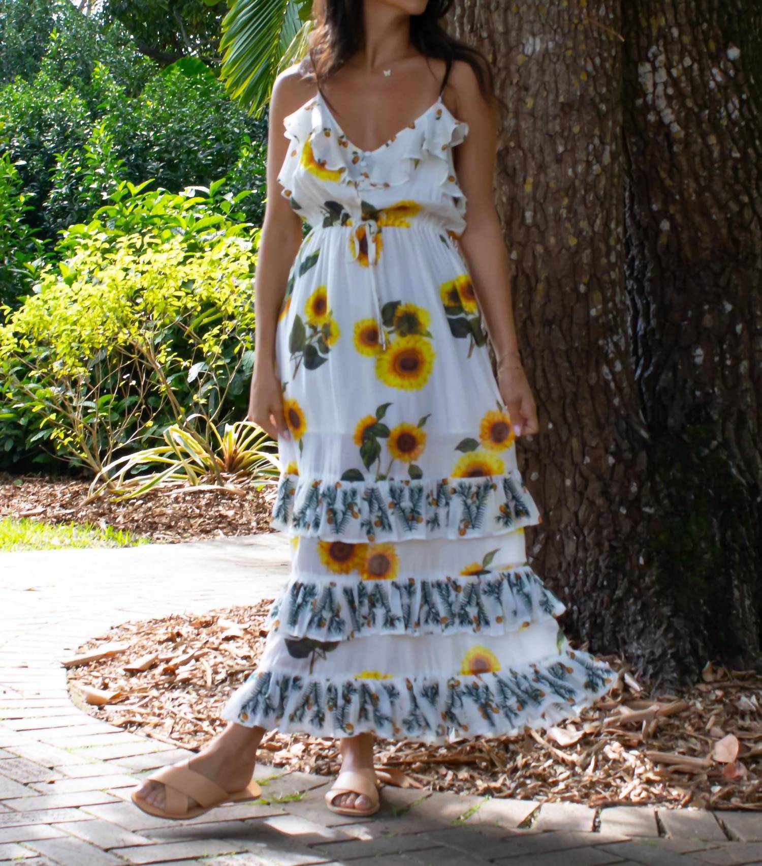 A midi dress so versatile, your options for wearing it are endless. Introducing the Megan Sunflower Dress by Guadalupe Design, a charming addition to your summer wardrobe. This A-line midi dress flaunts a delightful floral pattern in white, ideal for a sunny beach day. It features spaghetti straps and a scoopneck, offering a relaxed pull-on wearability. Care for this dress is simple with machine wash cold and options for low drying and dry cleaning.