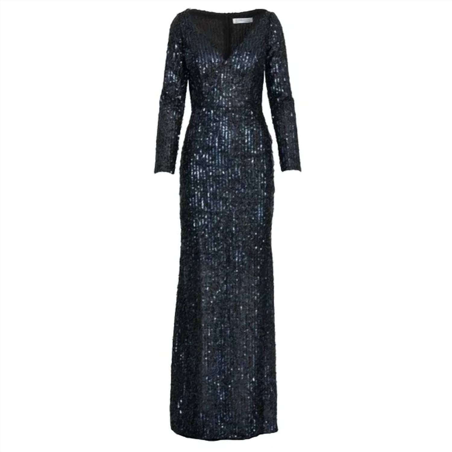 Elevate your evening look with the Ieena for Mac Duggal 26445 Long Sleeve Sequin Gown in a stunning midnight blue. This elegant gown features long sleeves and a faux-wrap V-neckline, crafted from paillette sequined fabric composed of 100% polyester. With an approximate garment length of 62.5 inches from shoulder to front hem, the design includes a thin satin belt at the natural waist for added sophistication. The concealed zip closure ensures a seamless finish, while the gown's timeless appeal is perfect for a New Year's Eve event.