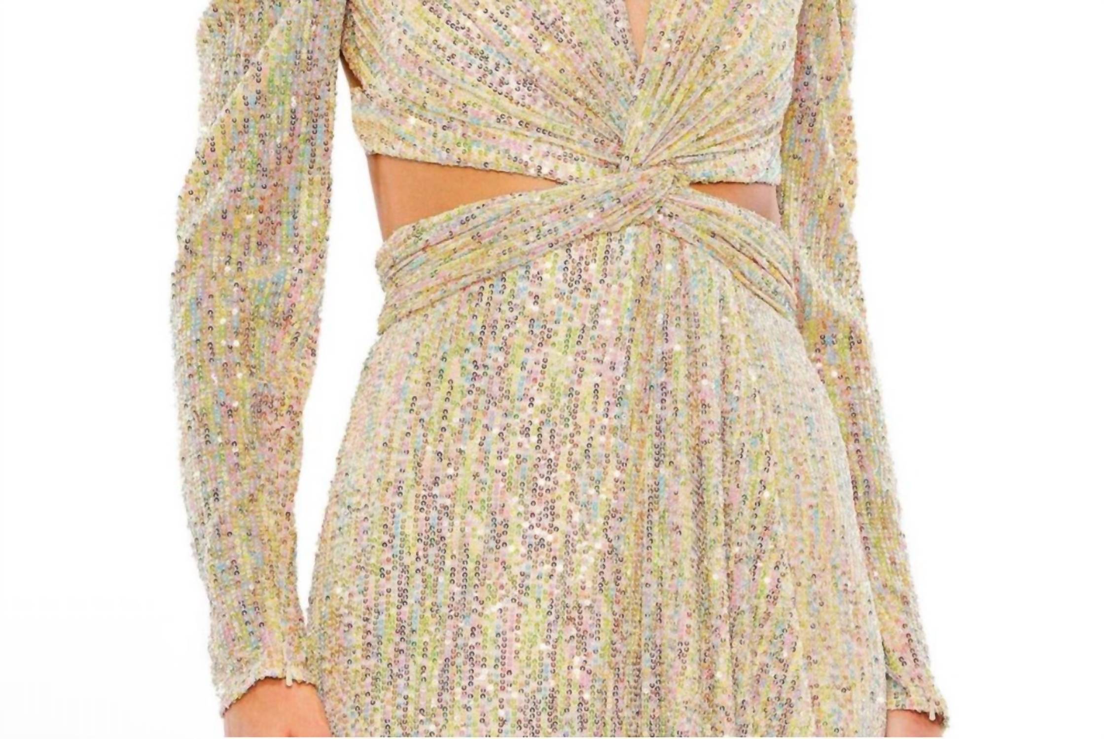 Who doesn't love a good maxi dress? This one you'll be reaching for season after season. Introducing the Metallic Puff Sleeve Front Twist Cut-out Gown by Ieena for Mac Duggal, a stunning choice for evening events. The gown features long puff sleeves, a V-neckline, and a captivating crisscross open back. Crafted from textured 100% polyester with a gold sequined mesh overlay, this sheath silhouette measures approximately 62.5" in length. The gown offers a zip closure and requires dry cleaning to maintain its exquisite design.