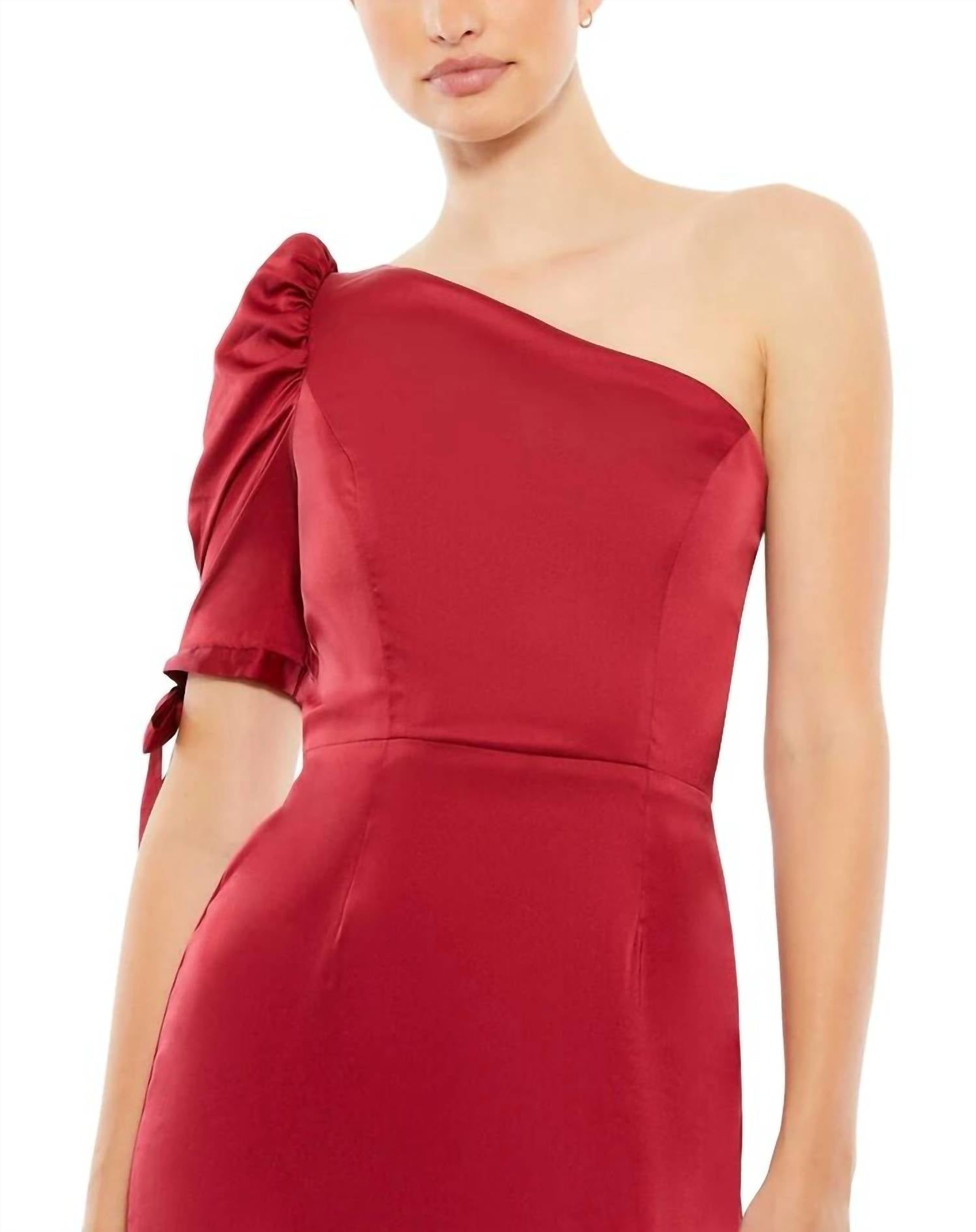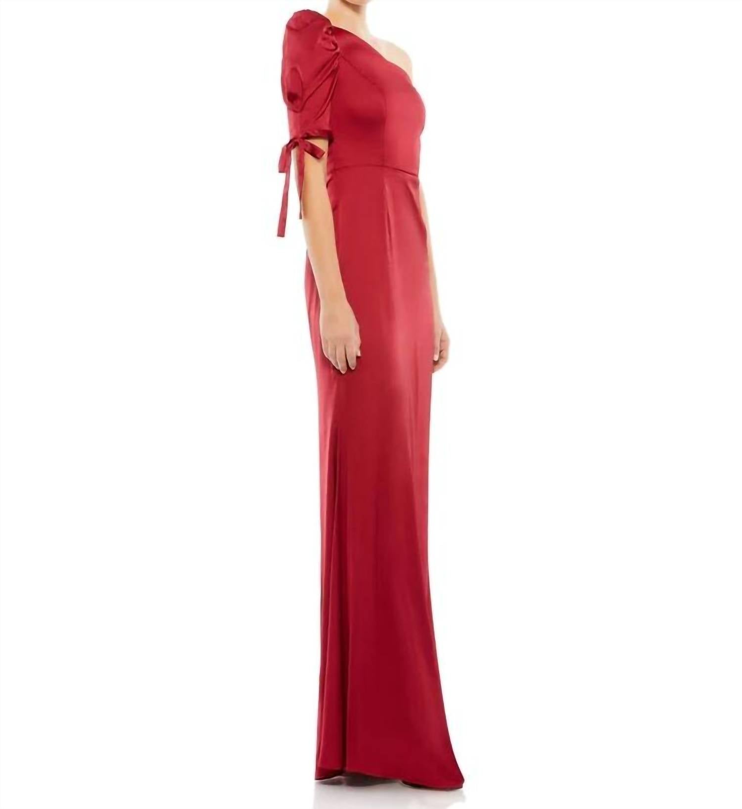 A maxi dress that is just as cute as it is comfortable. Introducing the Satin One Shoulder Puff Sleeve Trumpet Gown by Ieena for Mac Duggal, crafted to make a striking impression at evening events. This stunning piece in deep red boasts a short puff sleeve with a self-tie bow, made from 100% polyester satin for a luxurious feel. With a fit and flare silhouette and a dramatic 62.5" length, the gown elegantly cascades with a slight brush train. Closure: Zip closure. Ideal for adding sophisticated charm to any bridal party or gala.